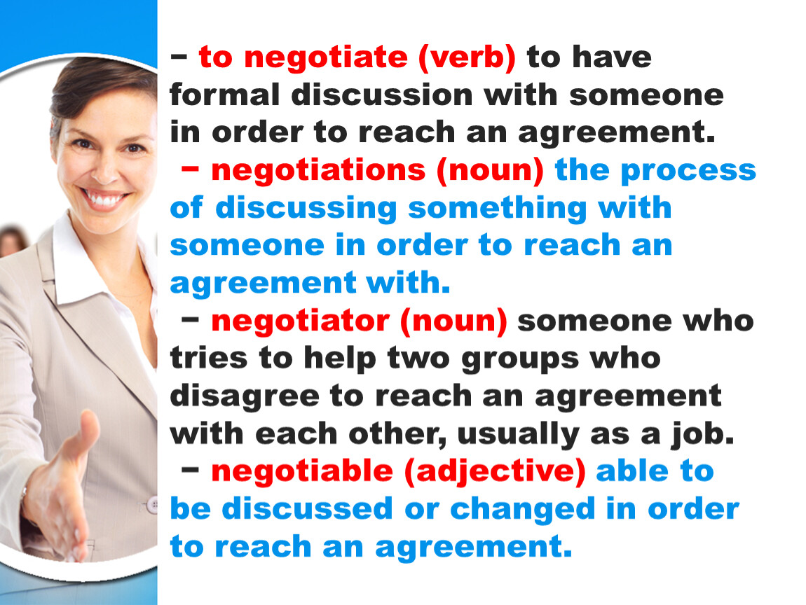 − to negotiate (verb) to have formal discussion with someone in order to reach an agreement.