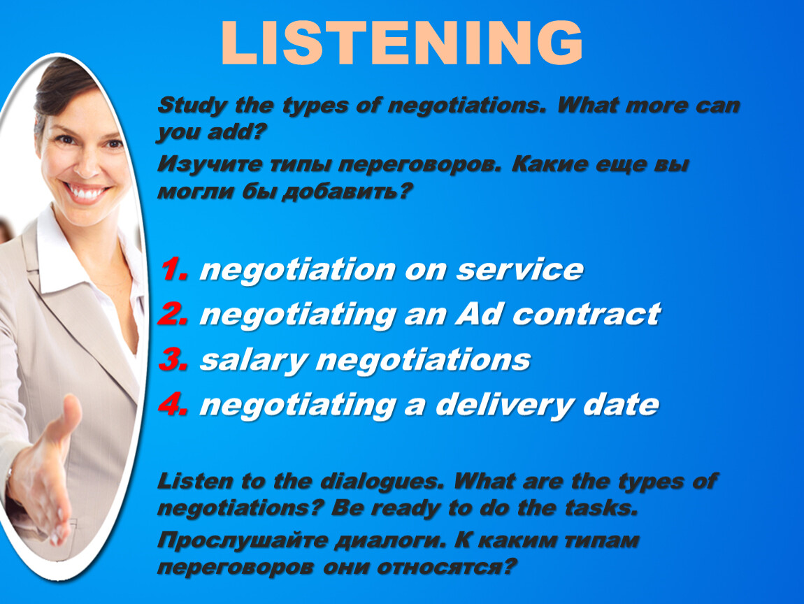 Listen to the dialogues. What are the types of negotiations? Be ready to do the tasks.