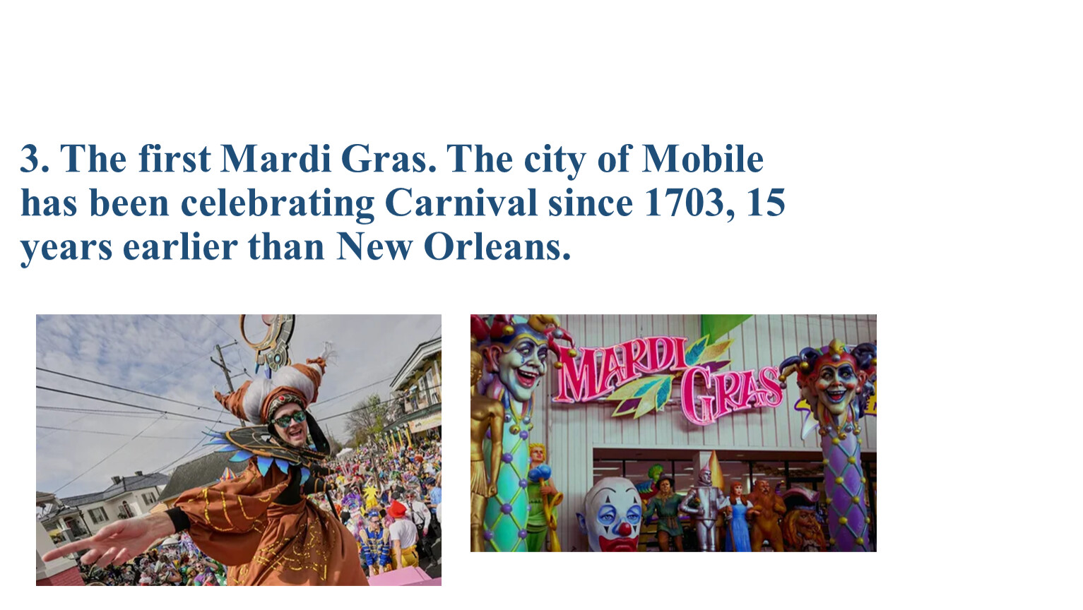 3. The first Mardi Gras. The city of Mobile has been celebrating Carnival since 1703, 15 years earlier than New Orleans.