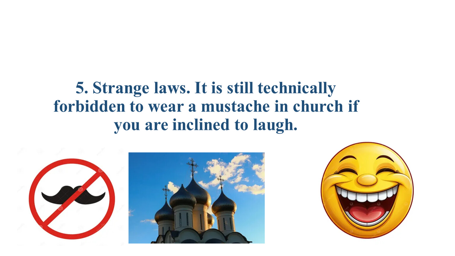 5. Strange laws. It is still technically forbidden to wear a mustache in church if you are inclined to laugh.