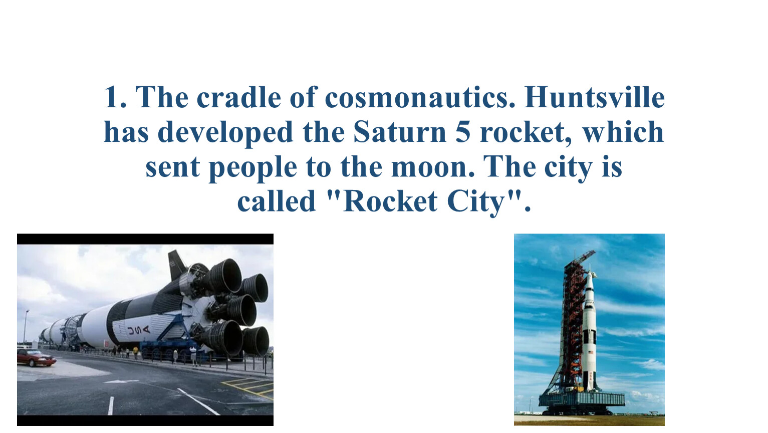 1. The cradle of cosmonautics. Huntsville has developed the Saturn 5 rocket, which sent people to the moon. The city is called "Rocket City".