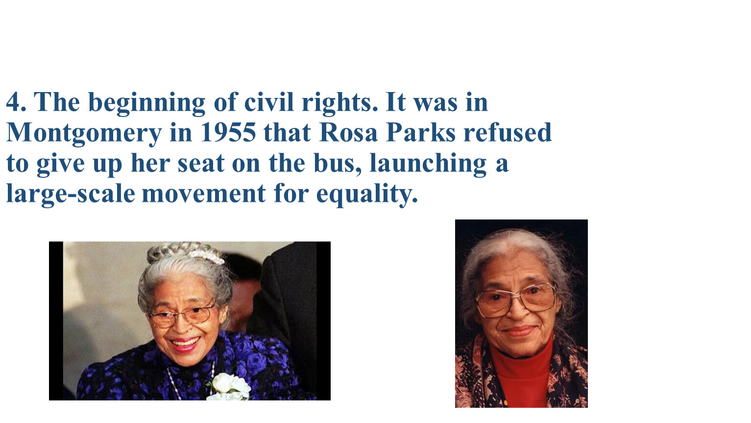4. The beginning of civil rights. It was in Montgomery in 1955 that Rosa Parks refused to give up her seat on the bus, launching a large-scale movement for equality.