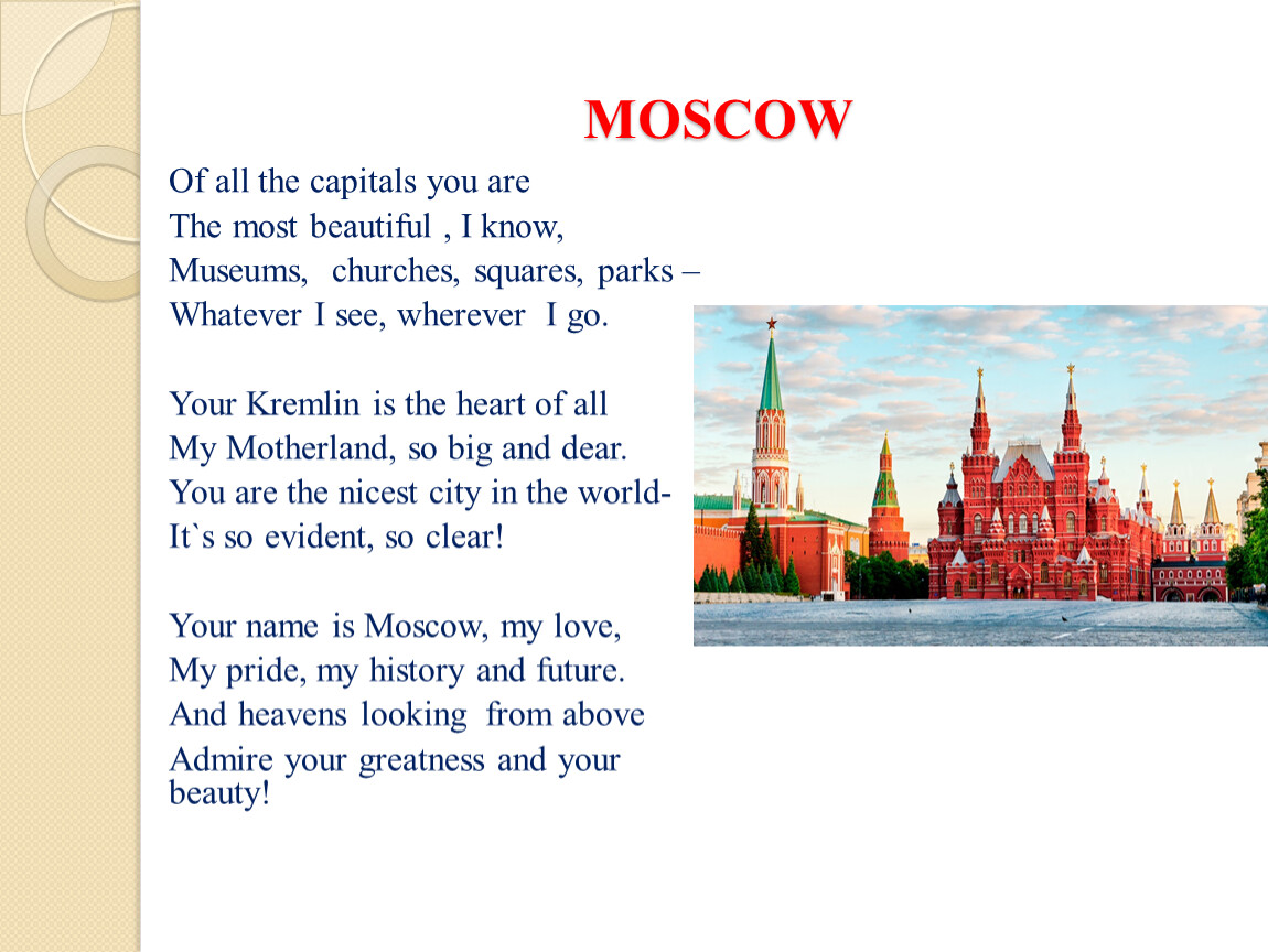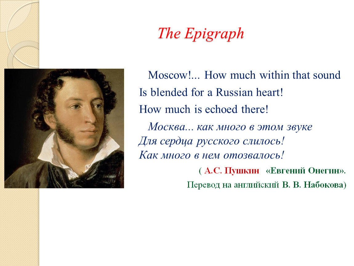 Москва... как много в этом звукеДля сердца русского слилось!Как много в нем отозвалось!