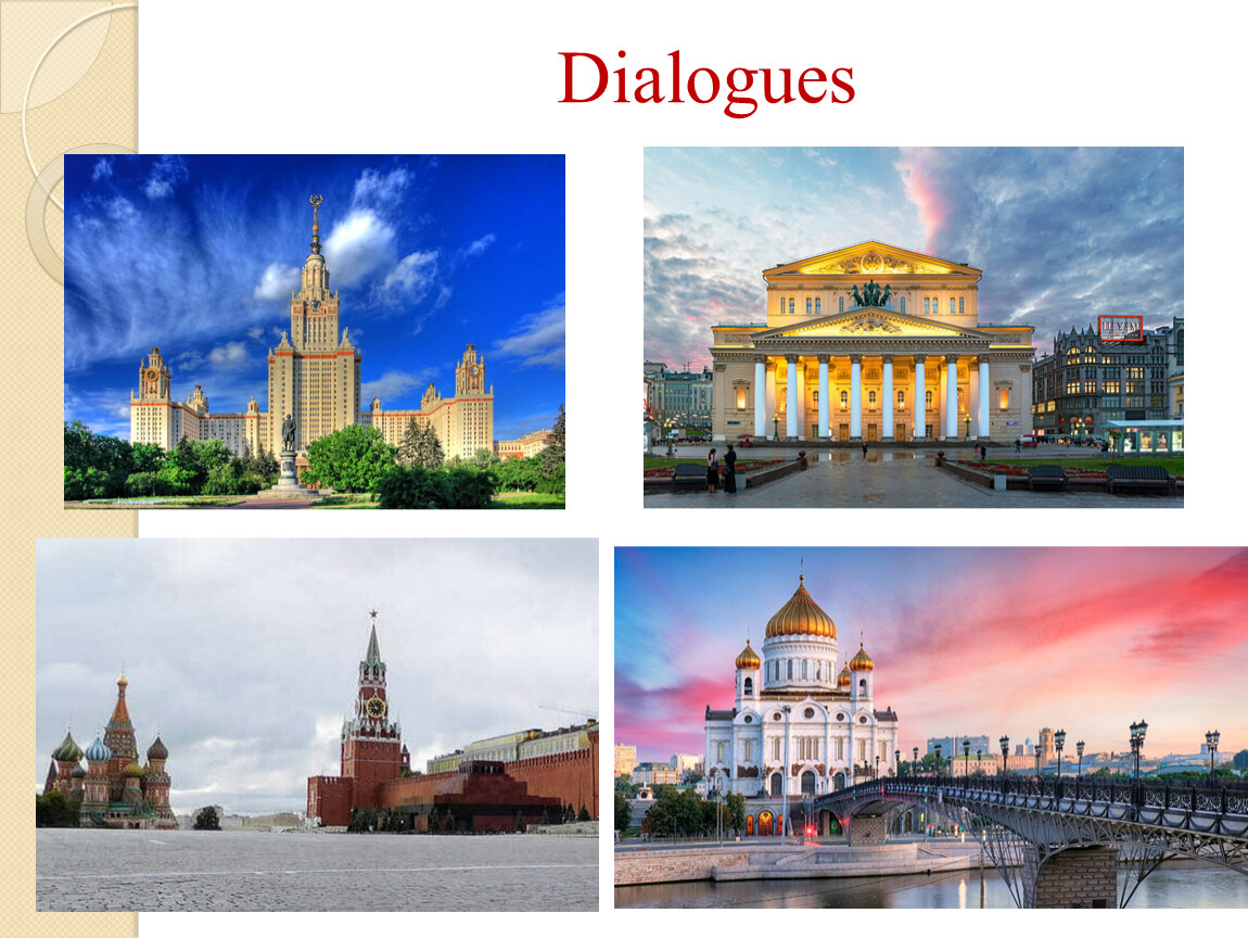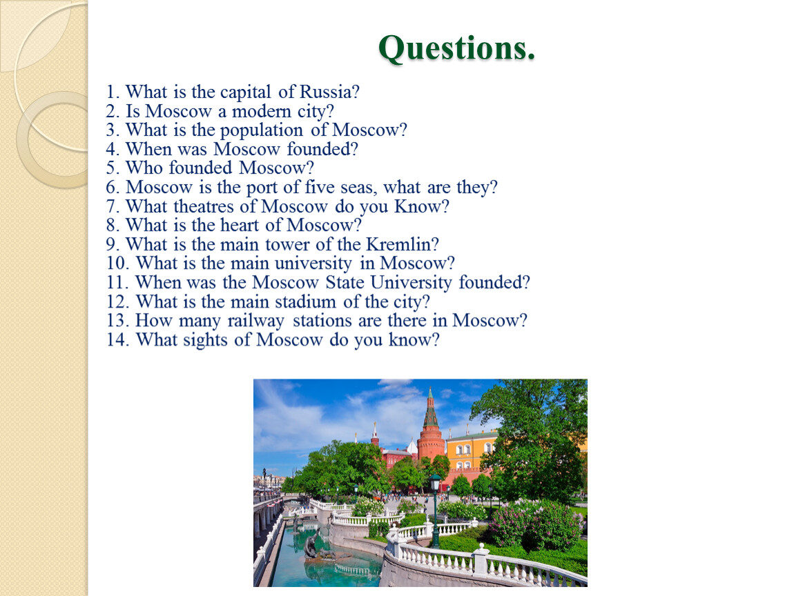 1. What is the capital of Russia?2. Is Moscow a modern city?3. What is the population of Moscow?4. When was Moscow founded?5. Who founded Moscow?6. Moscow is the port of five seas, what are they?7. What theatres of Moscow do you Know?8. What is the heart of Moscow?9. What is the main tower of the Kremlin?10. What is the main university in Moscow?11. When was the Moscow State University founded?12. What is the main stadium of the city?13. How many railway stations are there in Moscow?14. What sights of Moscow do you know?