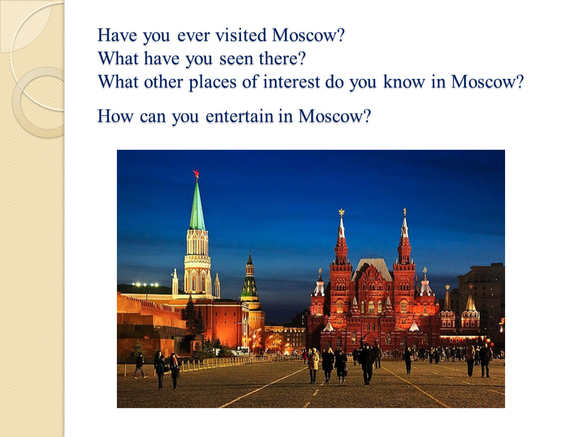 Have you ever visited Moscow?What have you seen there? What other places of interest do you know in Moscow? How can you entertain in Moscow?