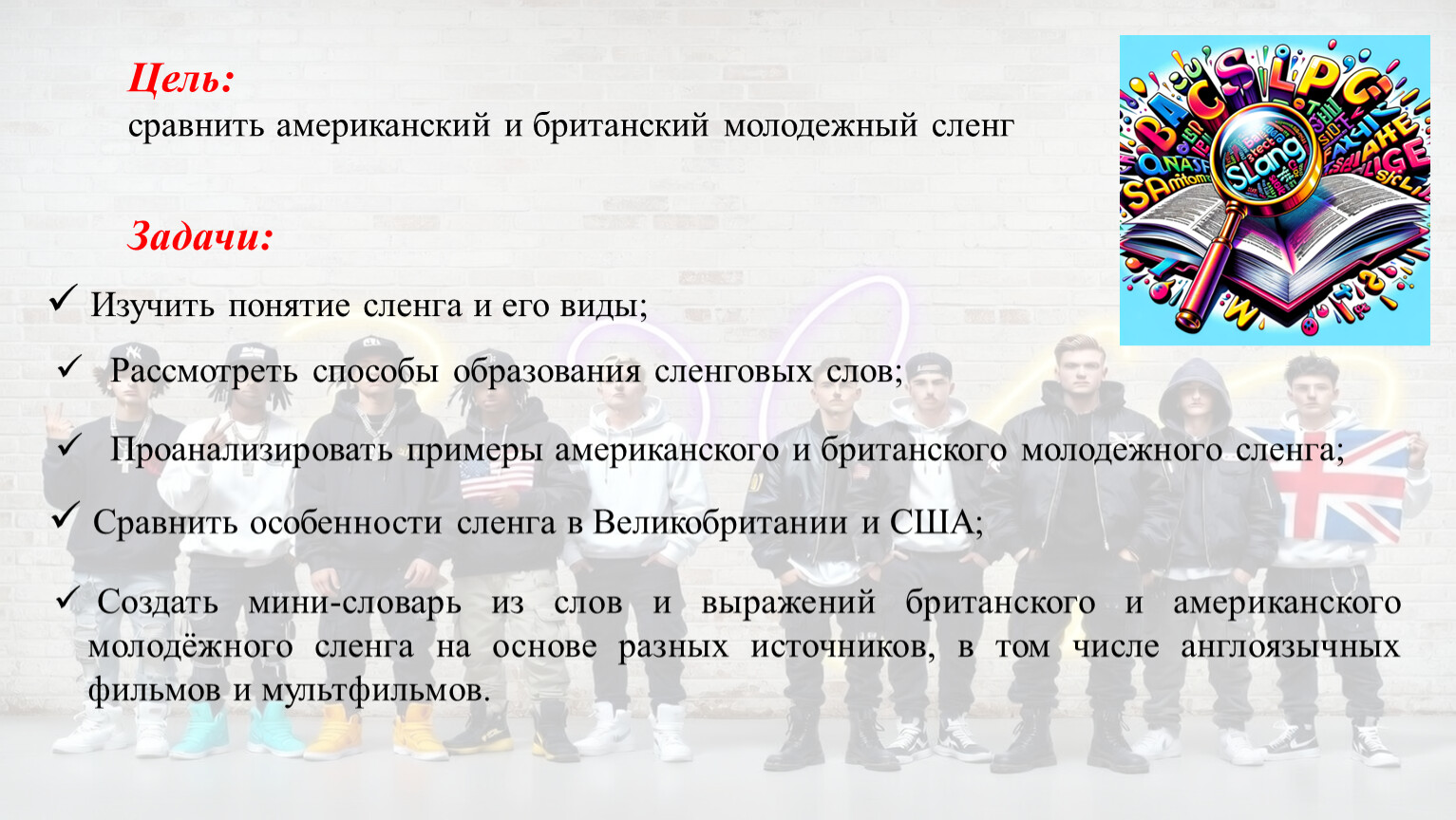 Создать мини-словарь из слов и выражений британского и американского молодёжного сленга на основе разных источников, в том числе англоязычных фильмов и мультфильмов.