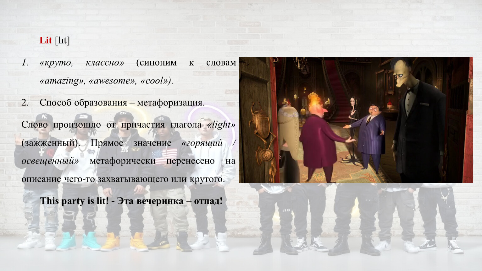Слово произошло от причастия глагола «light» (зажженный). Прямое значение «горящий / освещенный» метафорически перенесено на описание чего-то захватывающего или крутого.