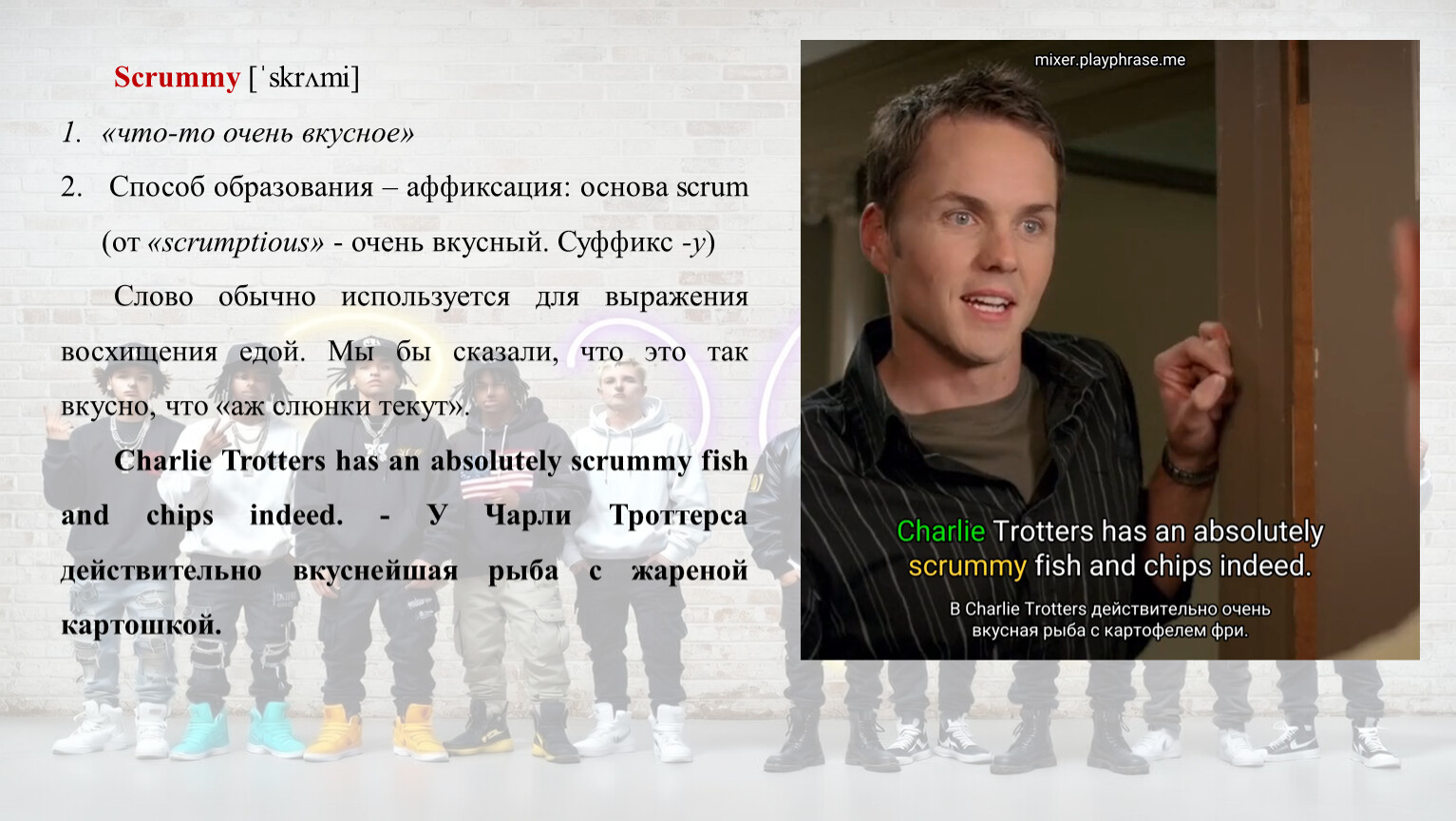 Способ образования – аффиксация: основа scrum (от «scrumptious» - очень вкусный. Суффикс -у)