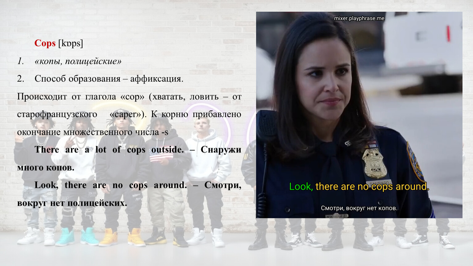 There are a lot of cops outside. – Снаружи много копов.