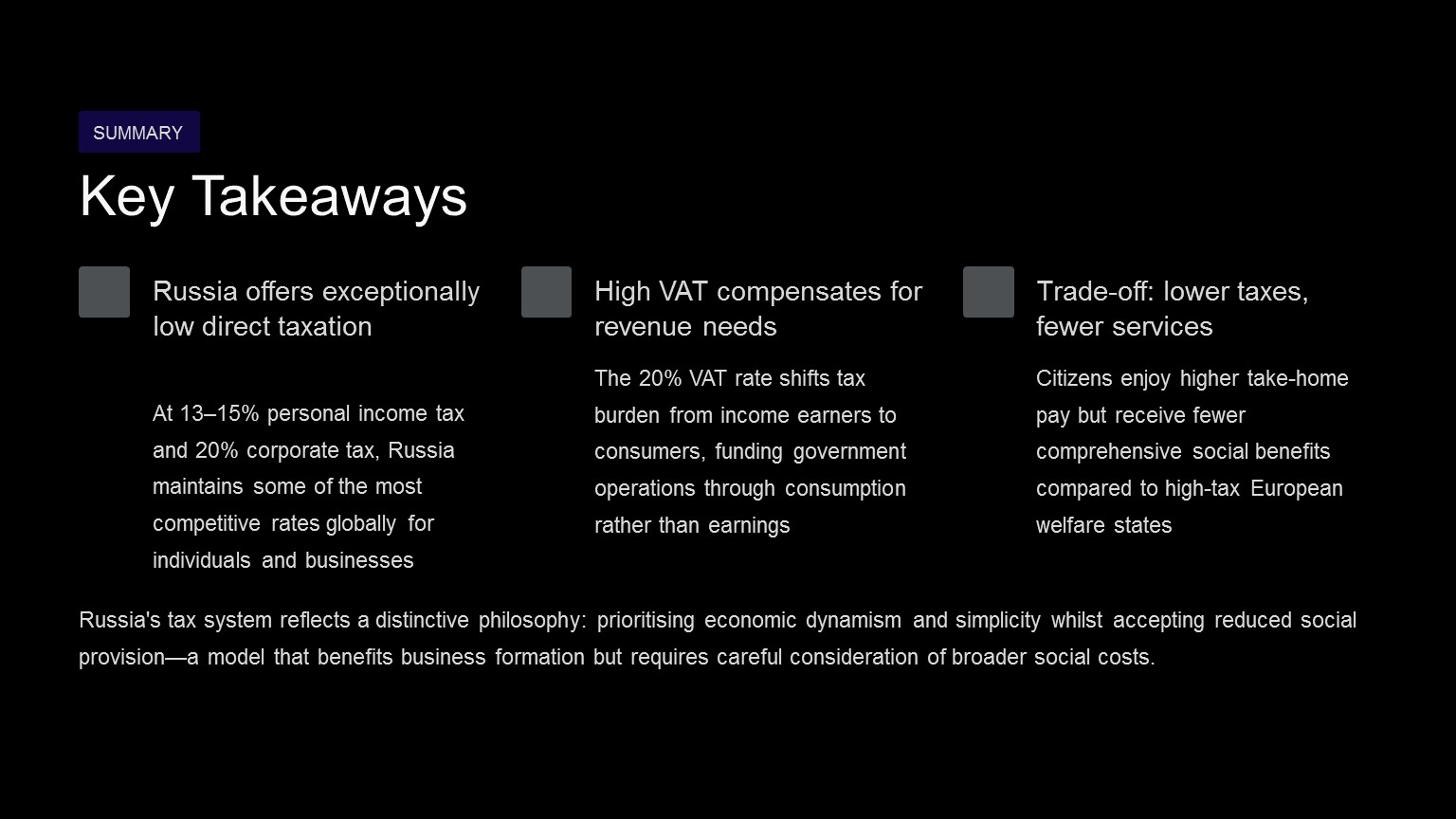 Russia's tax system reflects a distinctive philosophy: prioritising economic dynamism and simplicity whilst accepting reduced social provision—a model that benefits business formation but requires careful consideration of broader social costs.