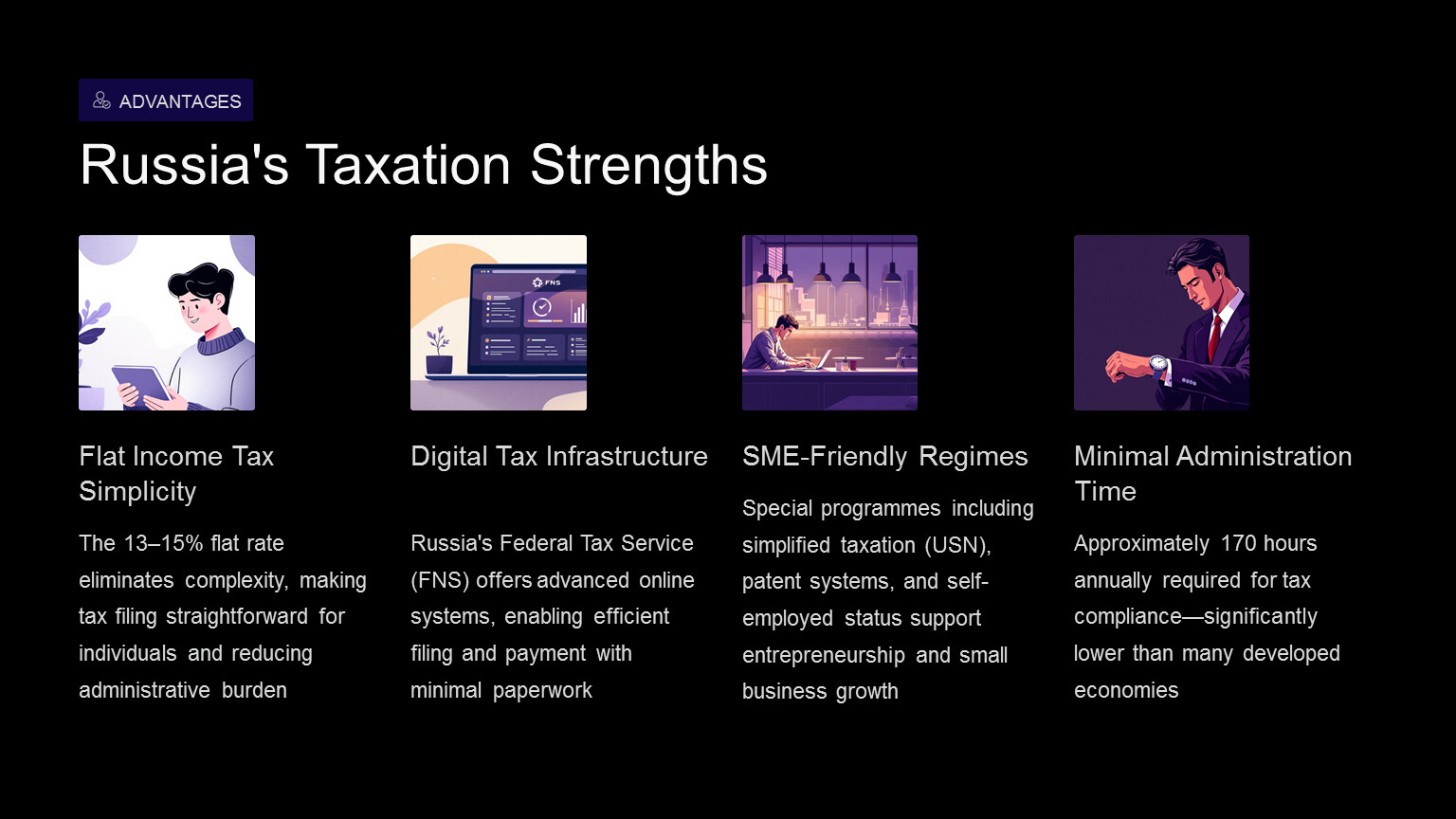 Russia's straightforward corporate tax structure provides predictability for business planning and reduces compliance complexity.