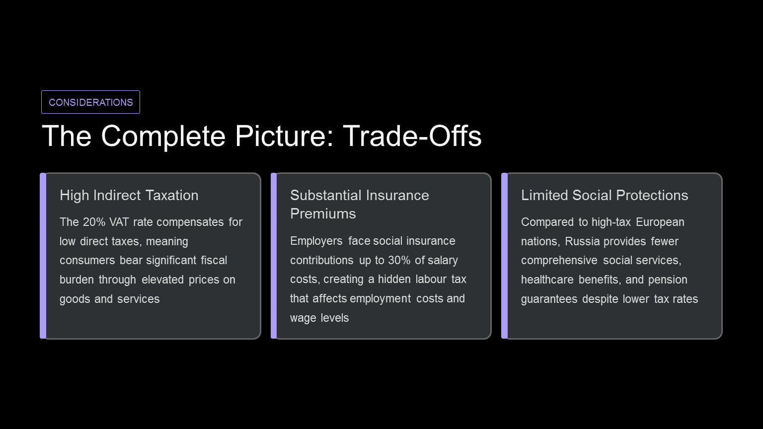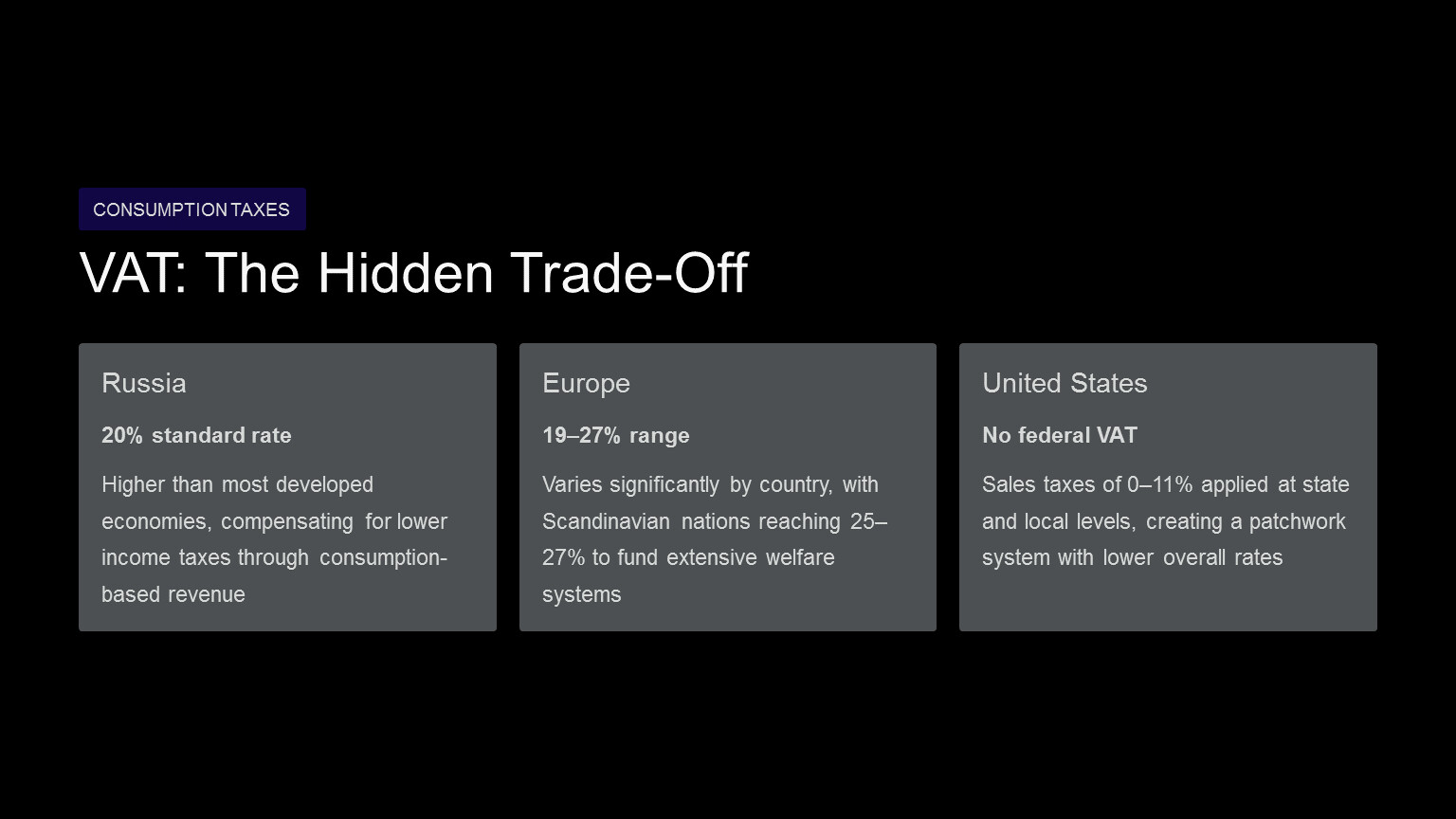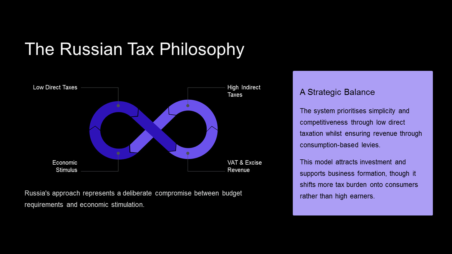 The Russian system reflects a strategic choice: maintaining competitive rates to attract business whilst ensuring budget stability through consumption-based taxes.