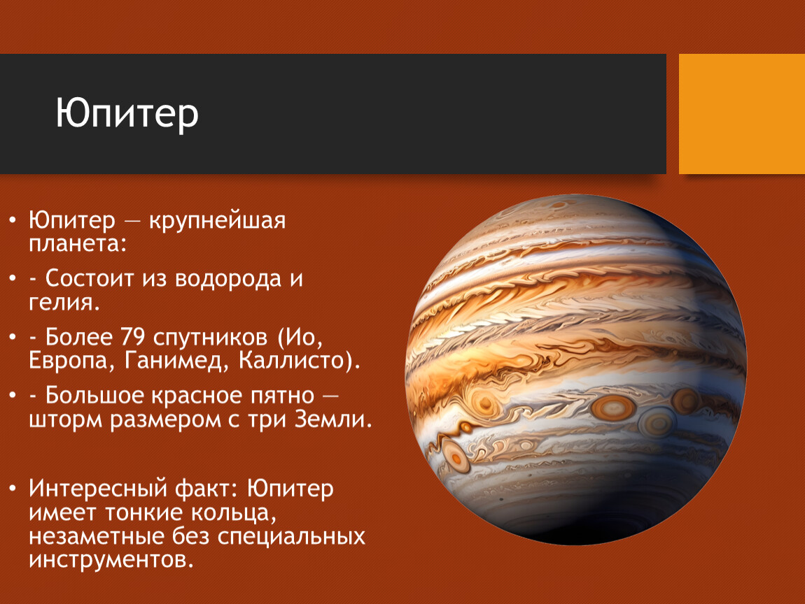Интересный факт: Юпитер имеет тонкие кольца, незаметные без специальных инструментов.