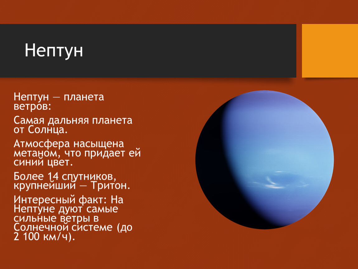 Интересный факт: На Нептуне дуют самые сильные ветры в Солнечной системе (до 2 100 км/ч).