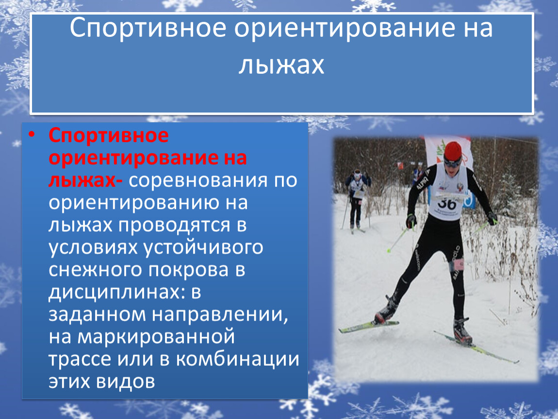 Спортивное ориентирование на лыжах- соревнования по ориентированию на лыжах проводятся в условиях устойчивого снежного покрова в дисциплинах: в заданном направлении, на маркированной трассе или в комбинации этих видов