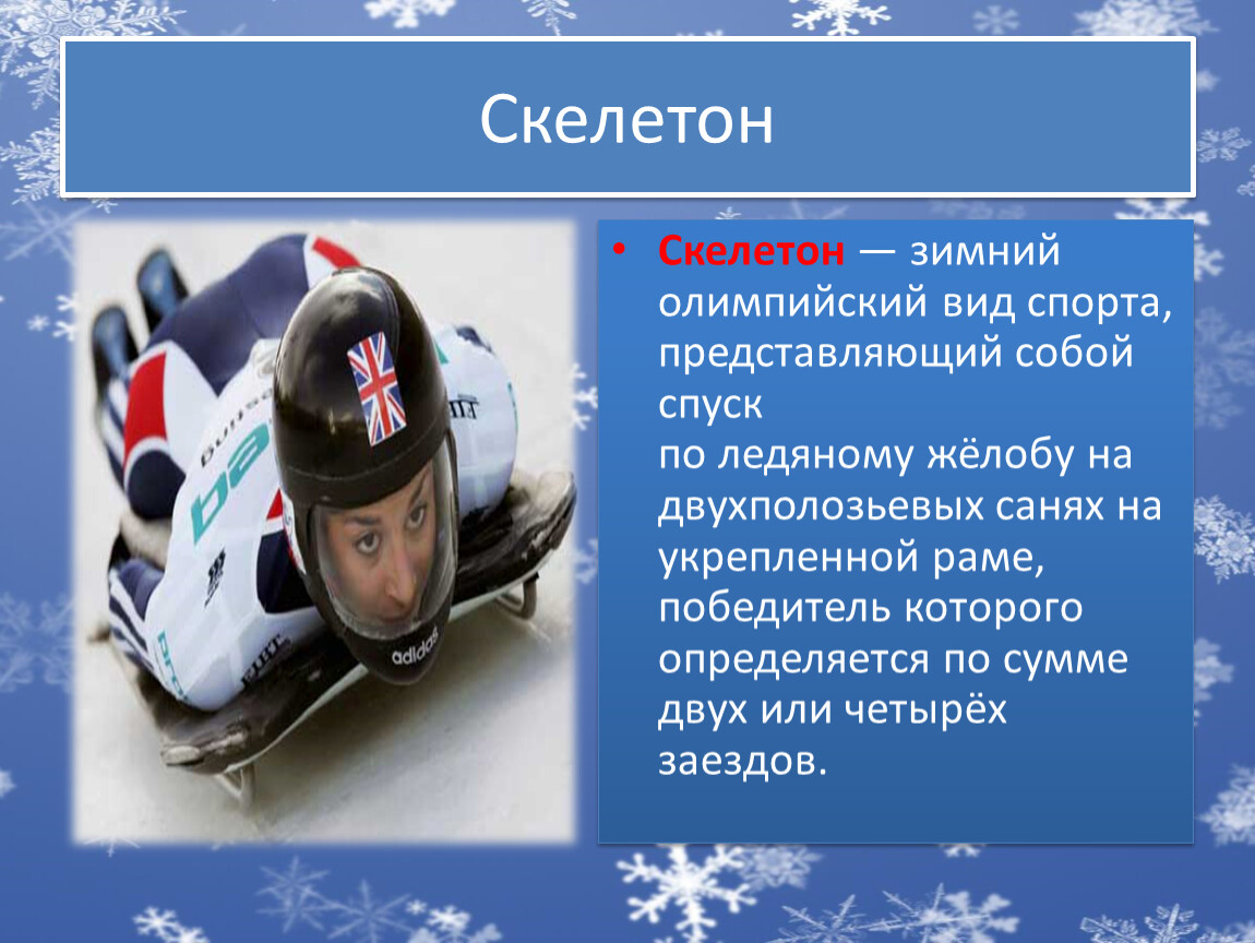Скелетон — зимний олимпийский вид спорта, представляющий собой спуск по ледяному жёлобу на двухполозьевых санях на укрепленной раме, победитель которого определяется по сумме двух или четырёх заездов.