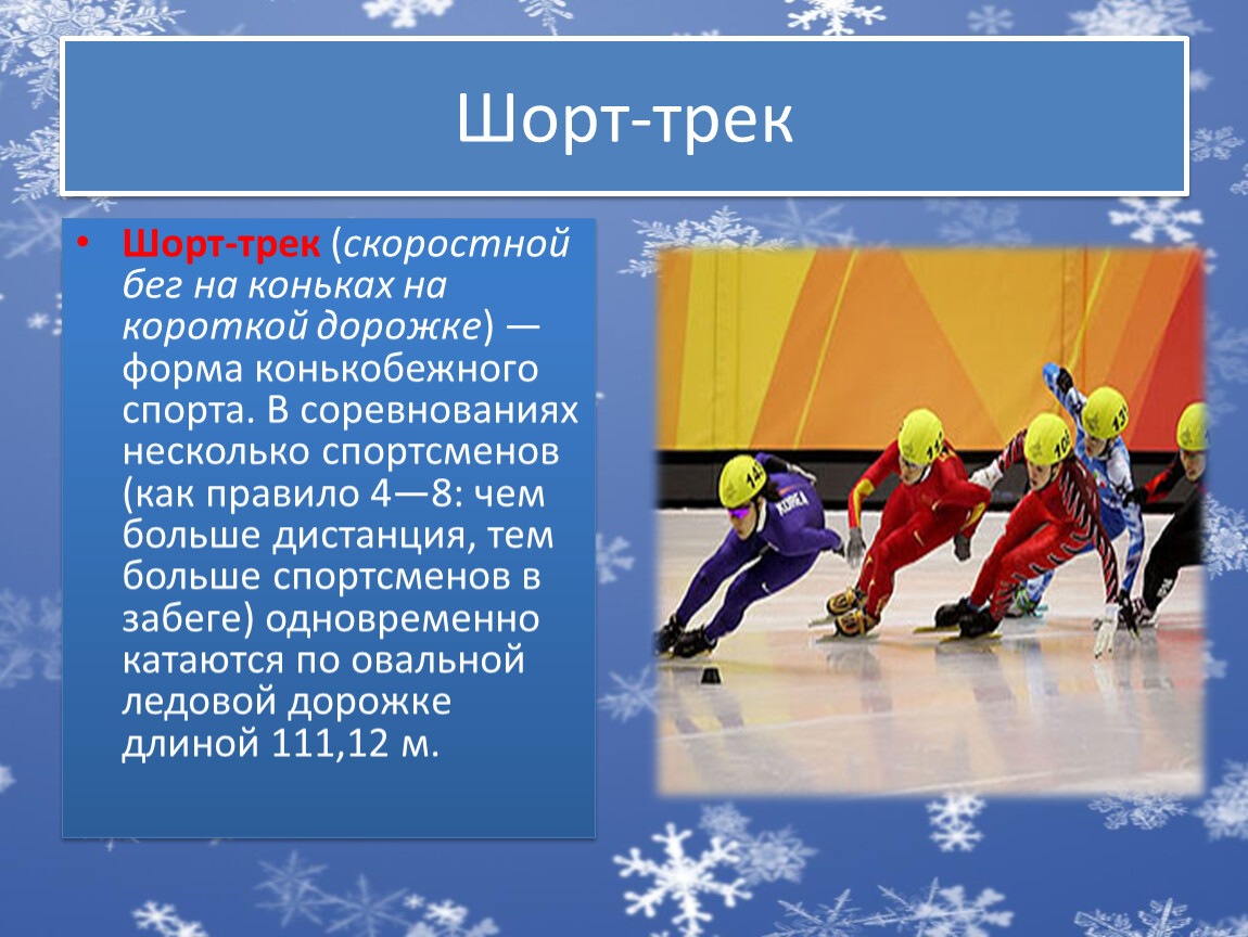 Шорт-трек (скоростной бег на коньках на короткой дорожке) — форма конькобежного спорта. В соревнованиях несколько спортсменов (как правило 4—8: чем больше дистанция, тем больше спортсменов в забеге) одновременно катаются по овальной ледовой дорожке длиной 111,12 м.