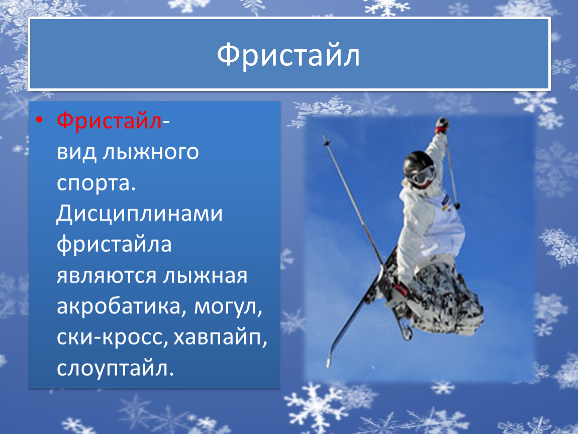 Фристайл-вид лыжного спорта. Дисциплинами фристайла являются лыжная акробатика, могул, ски-кросс, хавпайп, слоуптайл.