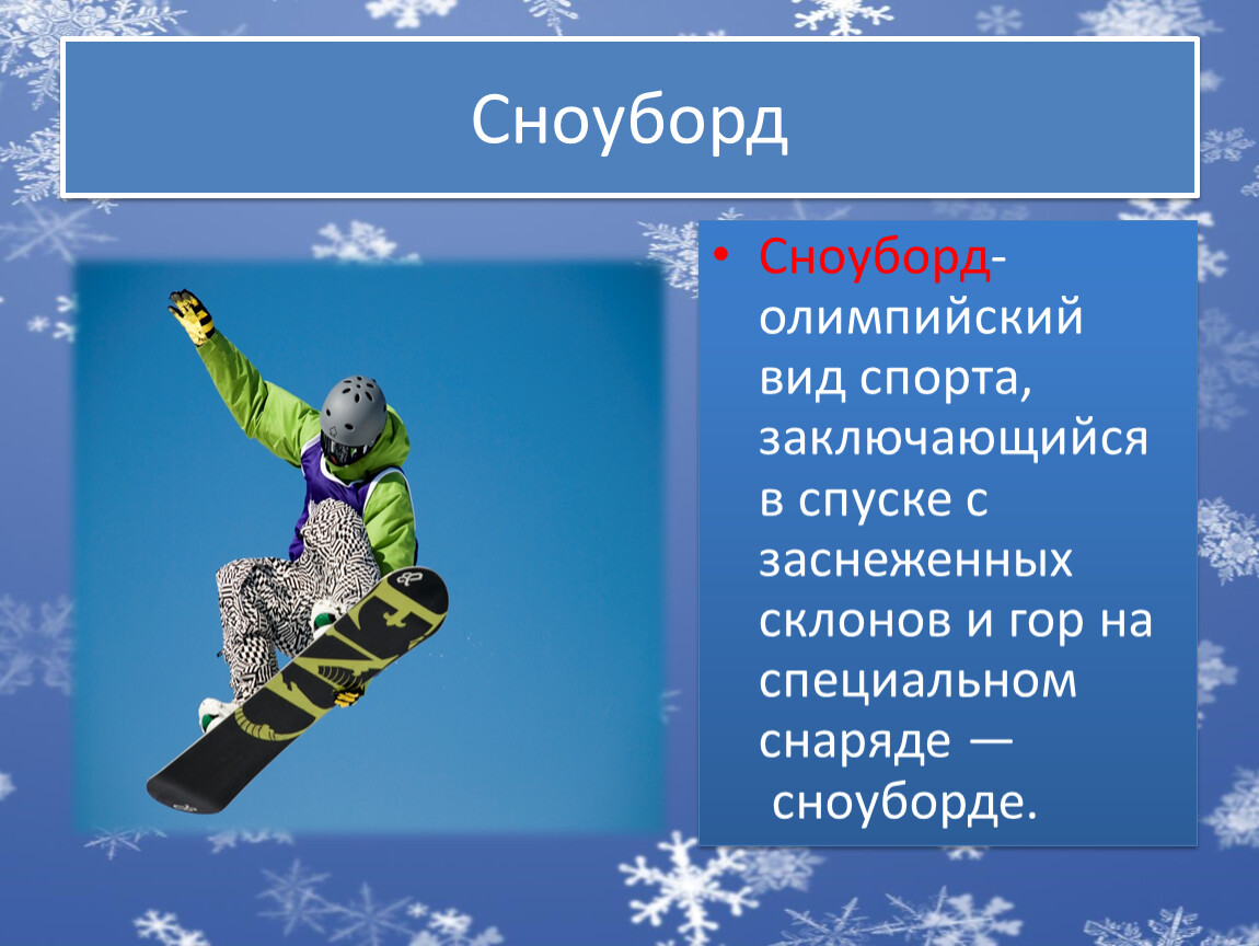 Сноуборд- олимпийский вид спорта, заключающийся в спуске с заснеженных склонов и гор на специальном снаряде — сноуборде.