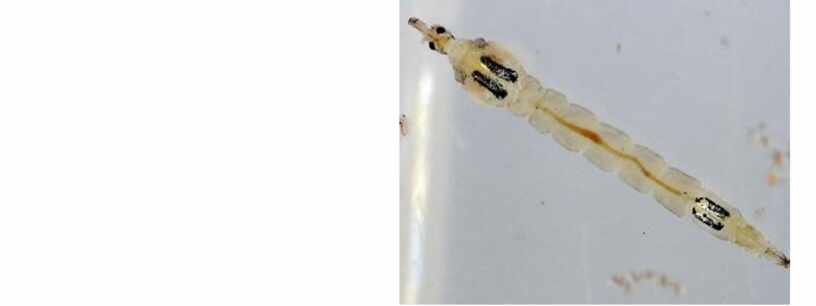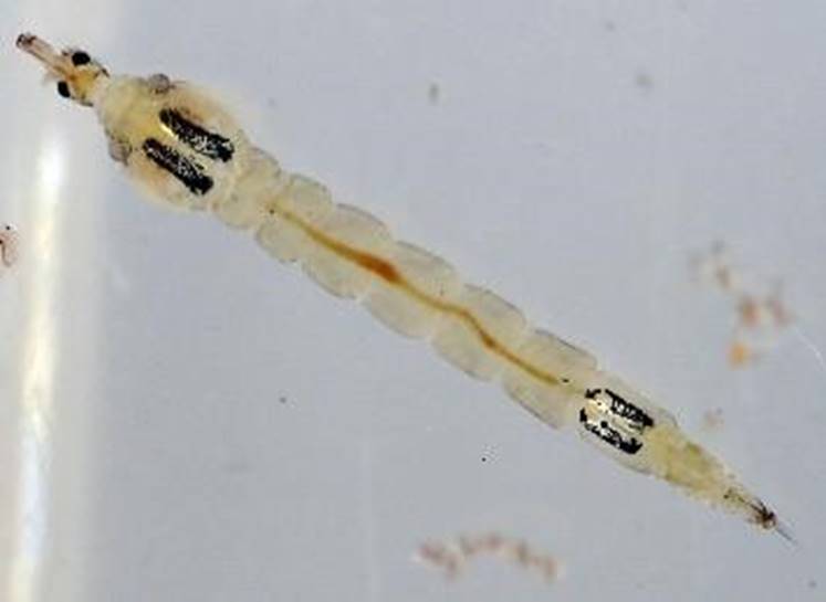 1. Перистоусого комара в воде не видно из-за его прозрачности, но глаза у этих существ хорошо заметны в виде черных точек.