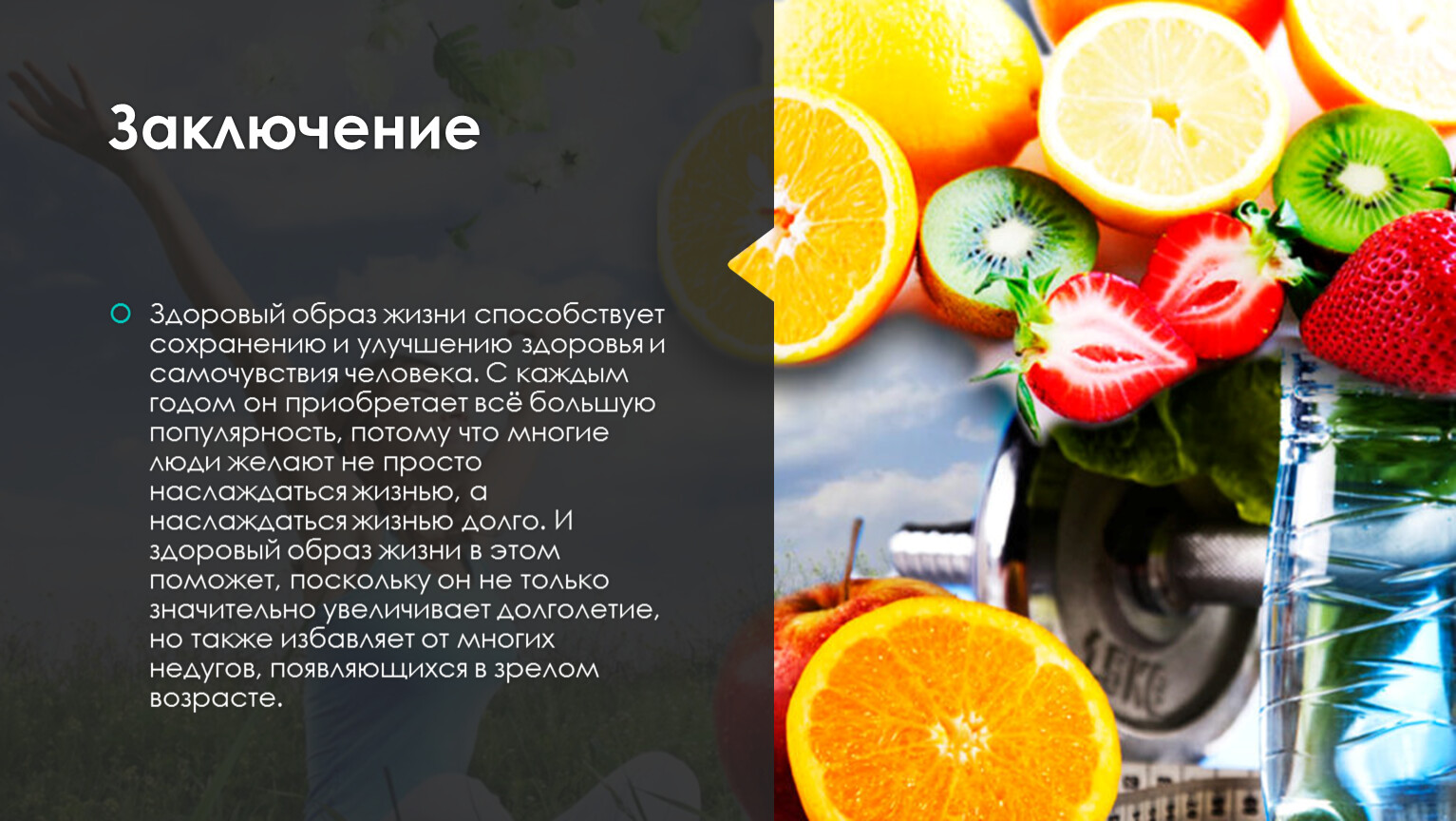 Здоровый образ жизни способствует сохранению и улучшению здоровья и самочувствия человека. С каждым годом он приобретает всё большую популярность, потому что многие люди желают не просто наслаждаться жизнью, а наслаждаться жизнью долго. И здоровый образ жизни в этом поможет, поскольку он не только значительно увеличивает долголетие, но также избавляет от многих недугов, появляющихся в зрелом возрасте.