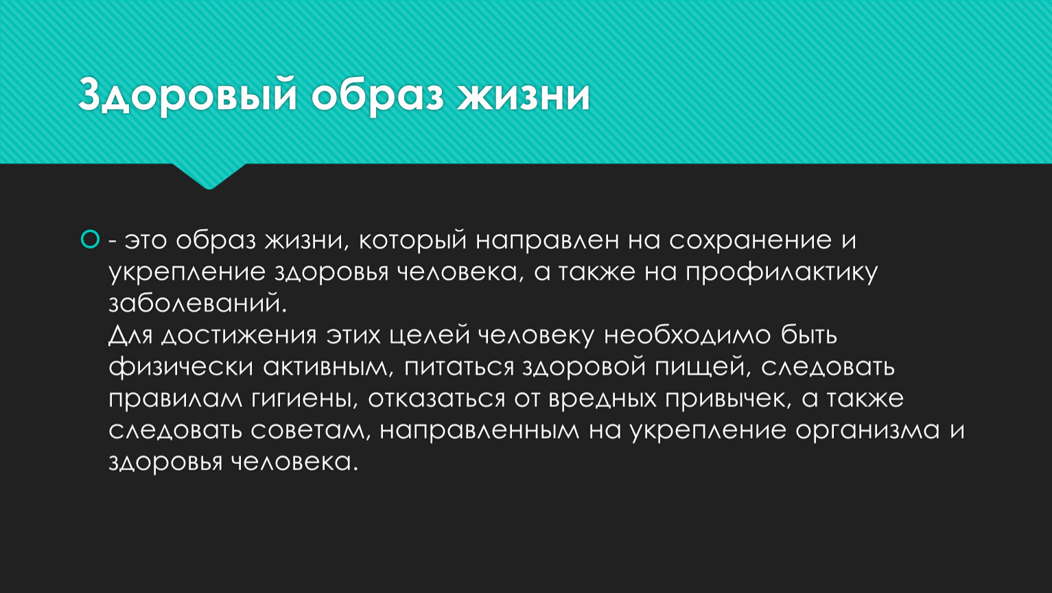 - это образ жизни, который направлен на сохранение и укрепление здоровья человека, а также на профилактику заболеваний.Для достижения этих целей человеку необходимо быть физически активным, питаться здоровой пищей, следовать правилам гигиены, отказаться от вредных привычек, а также следовать советам, направленным на укрепление организма и здоровья человека.