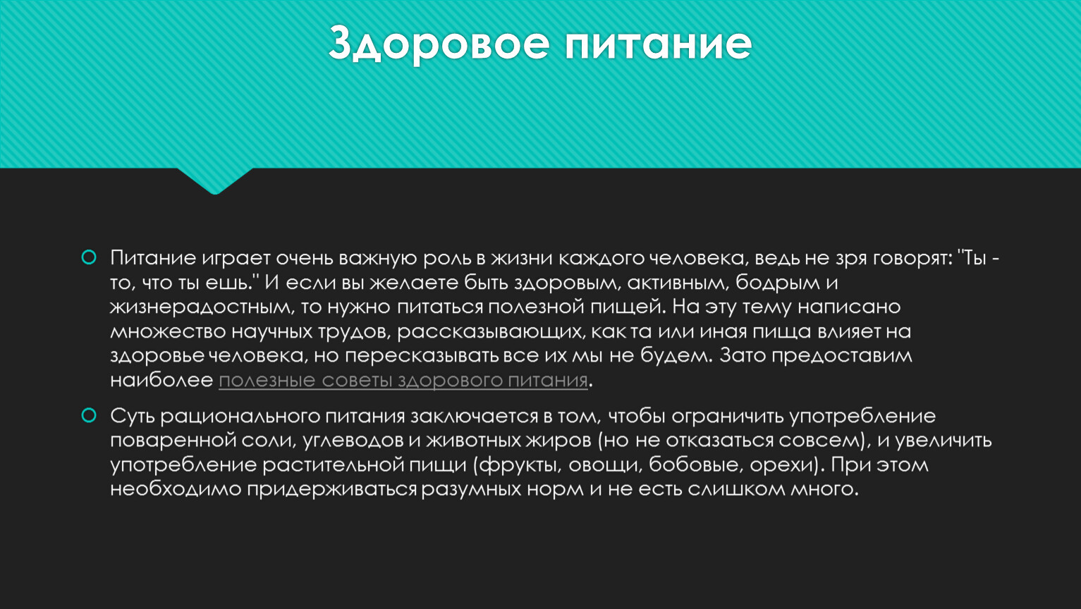 Питание играет очень важную роль в жизни каждого человека, ведь не зря говорят: "Ты - то, что ты ешь." И если вы желаете быть здоровым, активным, бодрым и жизнерадостным, то нужно питаться полезной пищей. На эту тему написано множество научных трудов, рассказывающих, как та или иная пища влияет на здоровье человека, но пересказывать все их мы не будем. Зато предоставим наиболее полезные советы здорового питания.