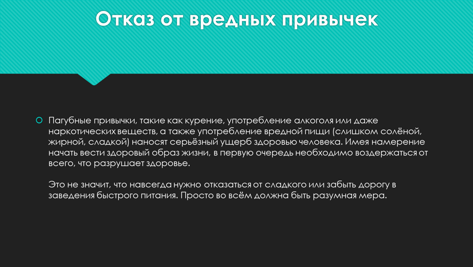 Пагубные привычки, такие как курение, употребление алкоголя или даже наркотических веществ, а также употребление вредной пищи (слишком солёной, жирной, сладкой) наносят серьёзный ущерб здоровью человека. Имея намерение начать вести здоровый образ жизни, в первую очередь необходимо воздержаться от всего, что разрушает здоровье.Это не значит, что навсегда нужно отказаться от сладкого или забыть дорогу в заведения быстрого питания. Просто во всём должна быть разумная мера.