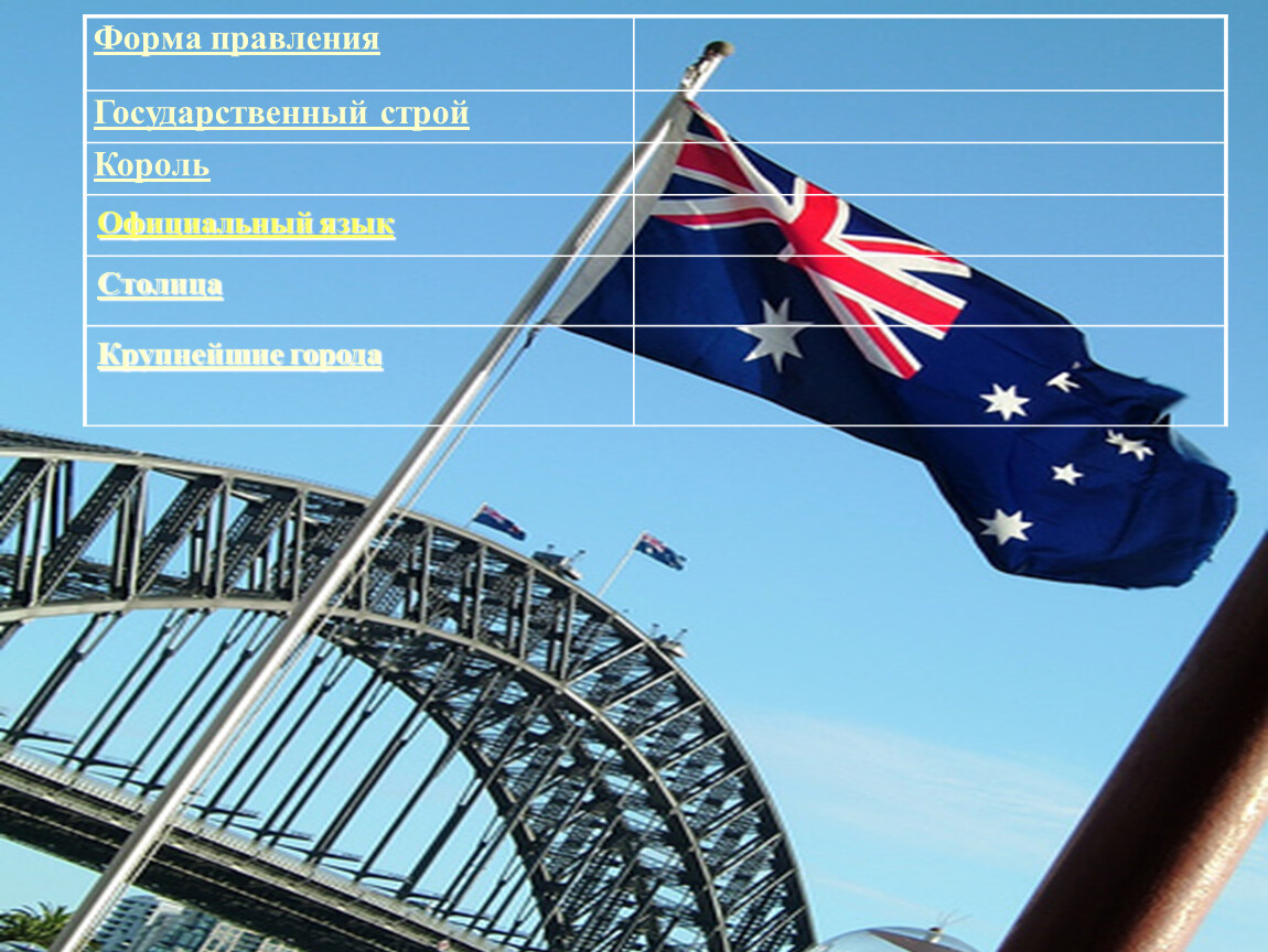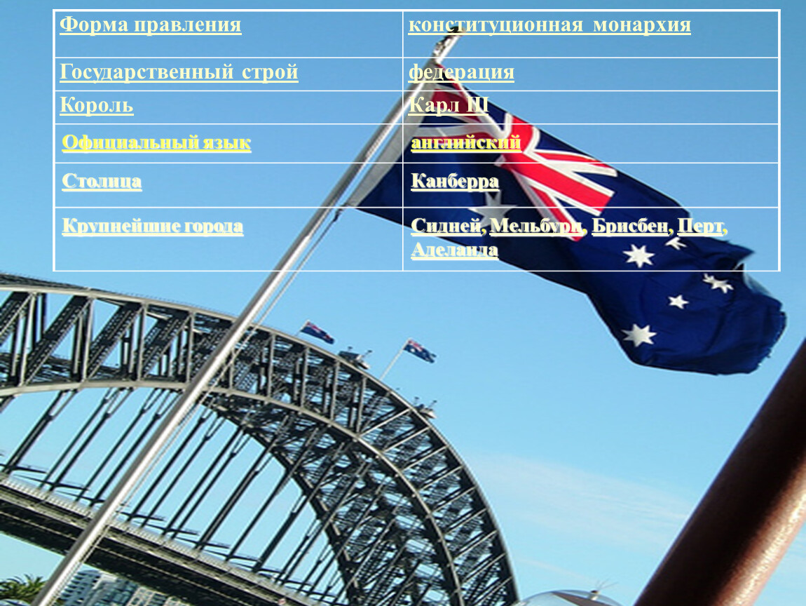 Крупнейшие города | Сидней, Мельбурн, Брисбен, Перт, Аделаида |