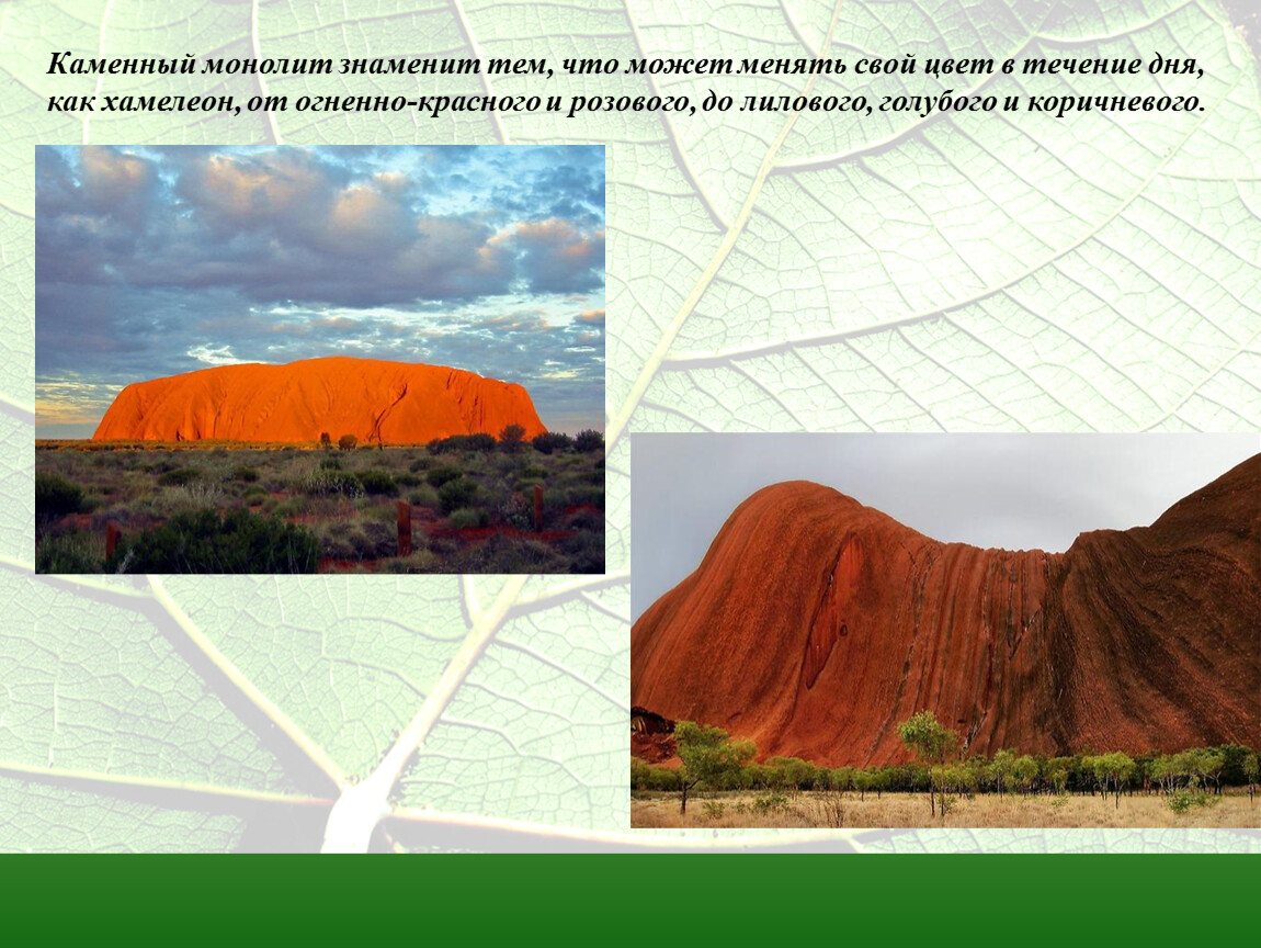 Каменный монолит знаменит тем, что может менять свой цвет в течение дня,