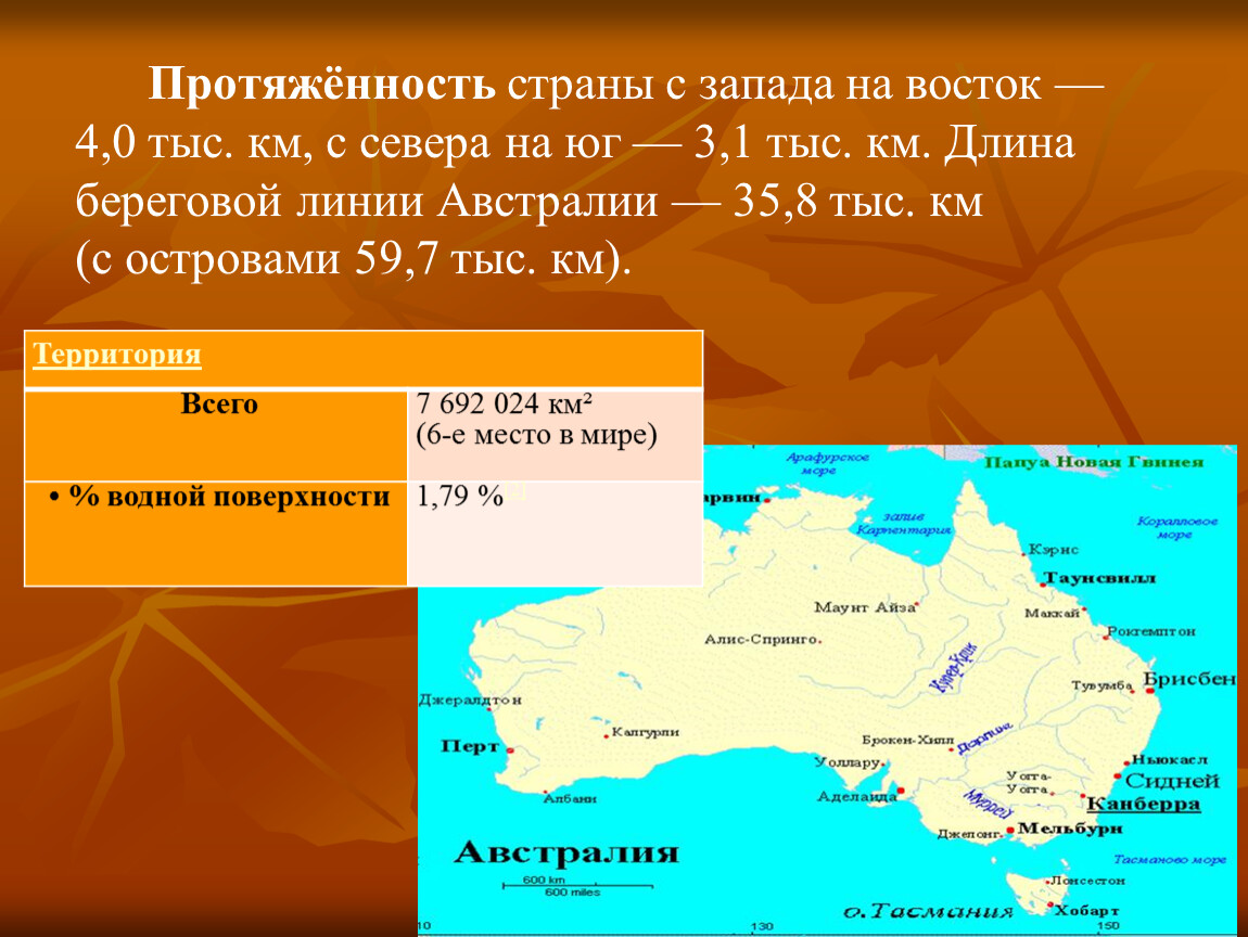 Протяжённость страны с запада на восток — 4,0 тыс. км, с севера на юг — 3,1 тыс. км. Длина береговой линии Австралии — 35,8 тыс. км (с островами 59,7 тыс. км).