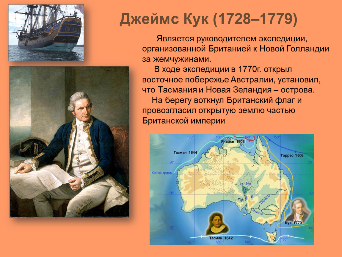 В ходе экспедиции в 1770г. открыл восточное побережье Австралии, установил, что Тасмания и Новая Зеландия – острова.
