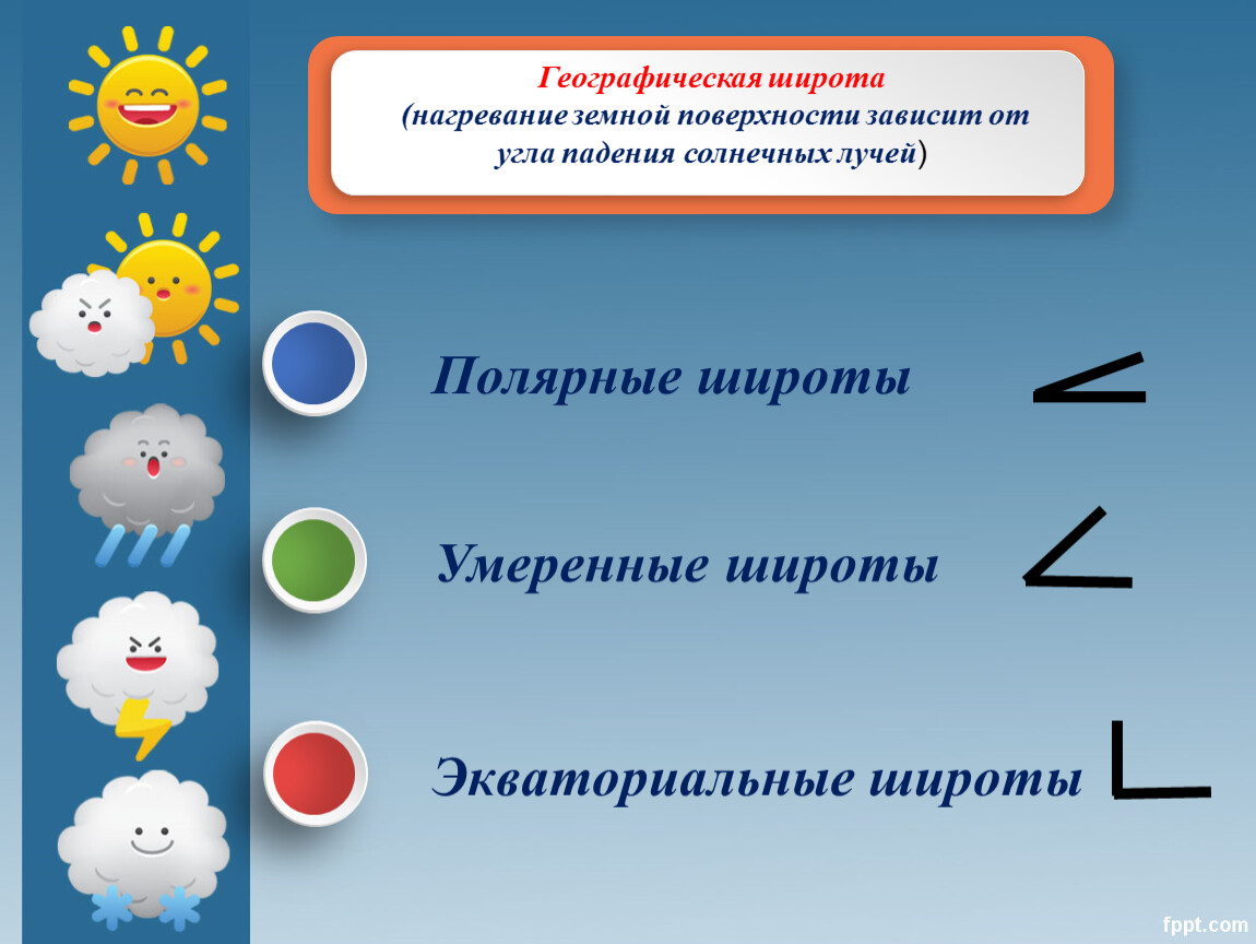 В зависимости от температурных условий, преобладающих воздушных масс и ветров выделяют климатические пояса