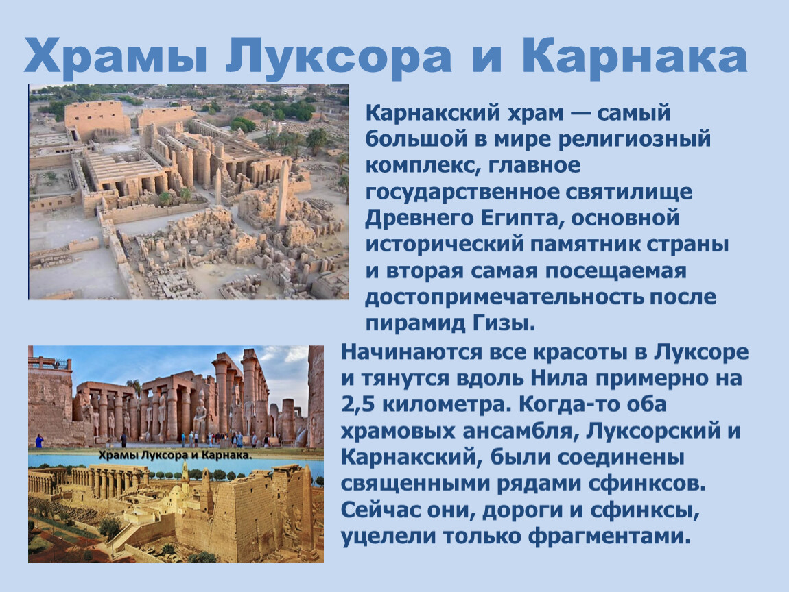 Карнакский храм — самый большой в мире религиозный комплекс, главное государственное святилище Древнего Египта, основной исторический памятник страны и вторая самая посещаемая достопримечательность после пирамид Гизы.