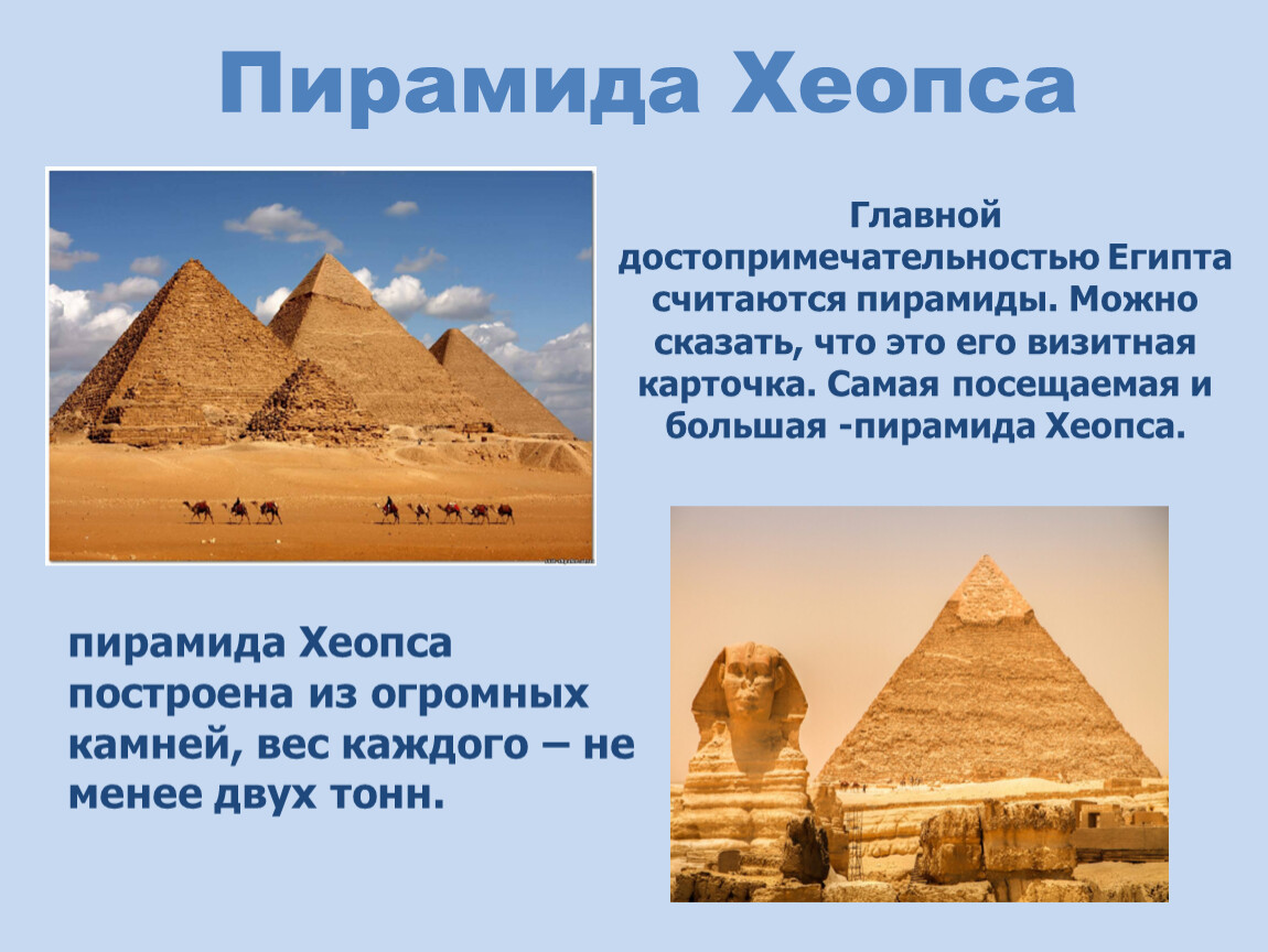Главной достопримечательностью Египта считаются пирамиды. Можно сказать, что это его визитная карточка. Самая посещаемая и большая -пирамида Хеопса.