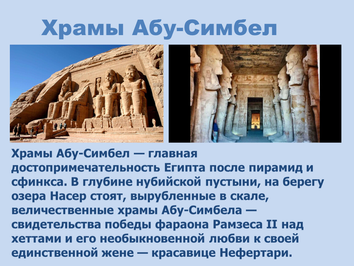 Храмы Абу-Симбел — главная достопримечательность Египта после пирамид и сфинкса. В глубине нубийской пустыни, на берегу озера Насер стоят, вырубленные в скале, величественные храмы Абу-Симбела — свидетельства победы фараона Рамзеса II над хеттами и его необыкновенной любви к своей единственной жене — красавице Нефертари.