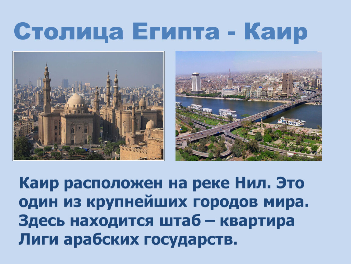 Каир расположен на реке Нил. Это один из крупнейших городов мира. Здесь находится штаб – квартира Лиги арабских государств.