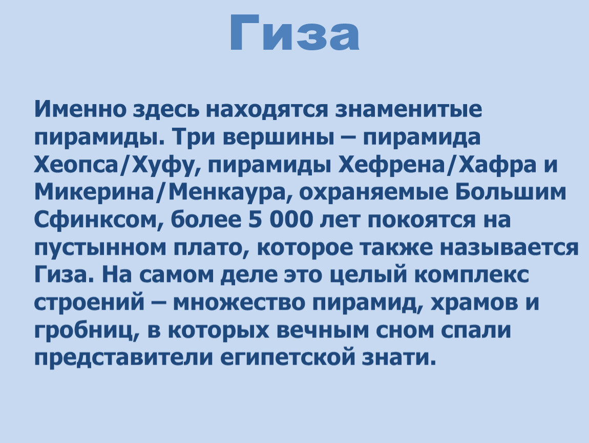 Именно здесь находятся знаменитые пирамиды. Три вершины – пирамида Хеопса/Хуфу, пирамиды Хефрена/Хафра и Микерина/Менкаура, охраняемые Большим Сфинксом, более 5 000 лет покоятся на пустынном плато, которое также называется Гиза. На самом деле это целый комплекс строений – множество пирамид, храмов и гробниц, в которых вечным сном спали представители египетской знати.