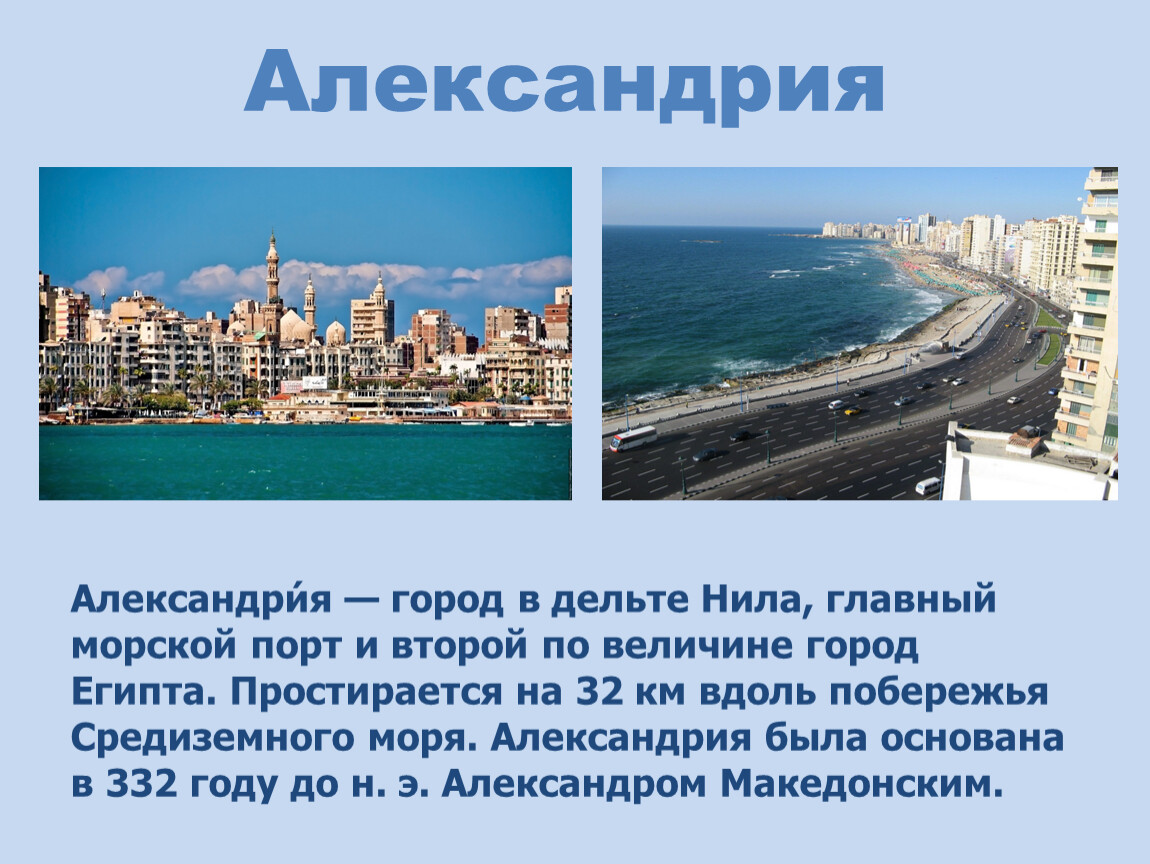 Александри́я — город в дельте Нила, главный морской порт и второй по величине город Египта. Простирается на 32 км вдоль побережья Средиземного моря. Александрия была основана в 332 году до н. э. Александром Македонским.