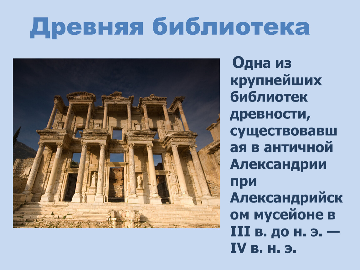 Одна из крупнейших библиотек древности, существовавшая в античной Александрии при Александрийском мусейоне в III в. до н. э. — IV в. н. э.