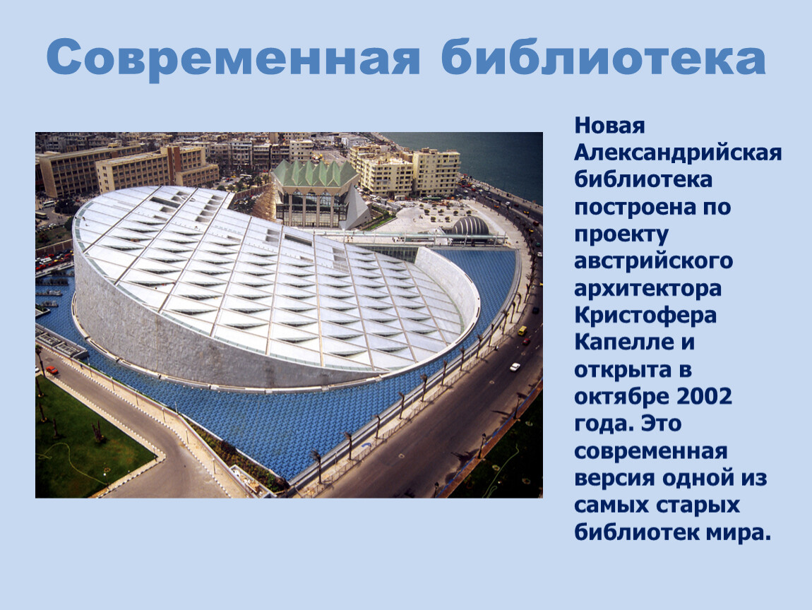 Новая Александрийская библиотека построена по проекту австрийского архитектора Кристофера Капелле и открыта в октябре 2002 года. Это современная версия одной из самых старых библиотек мира.