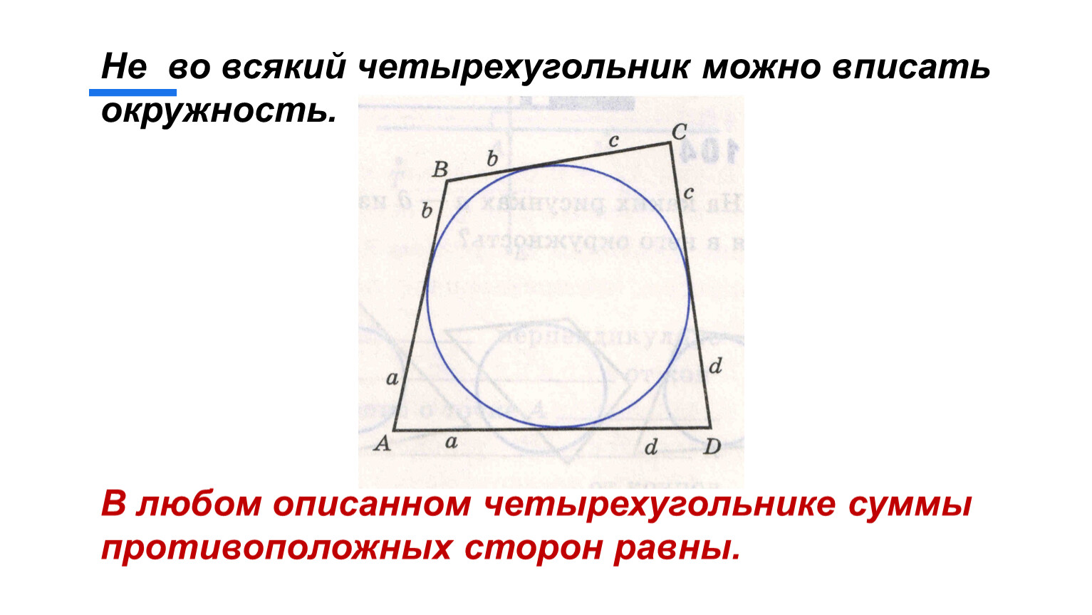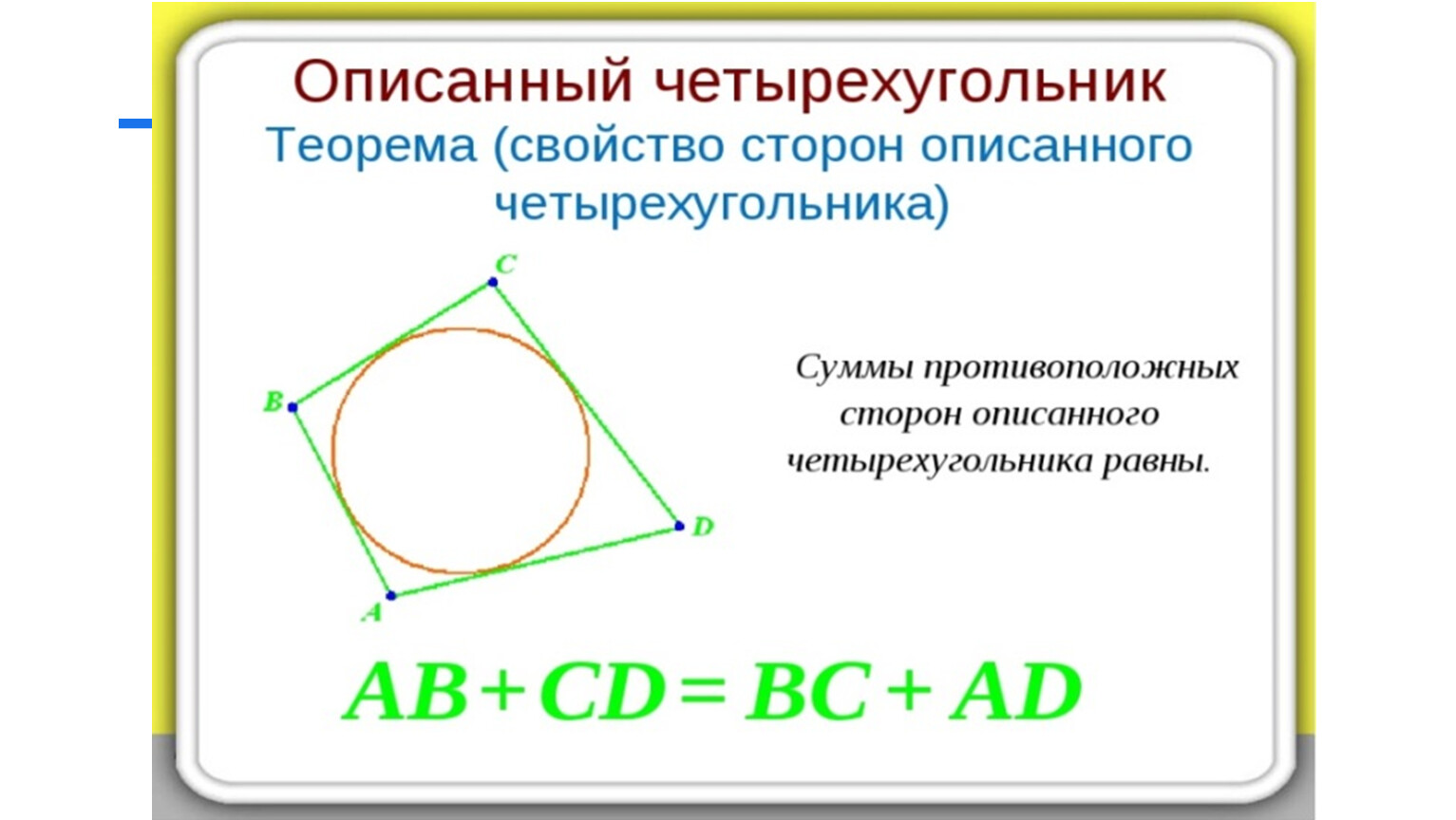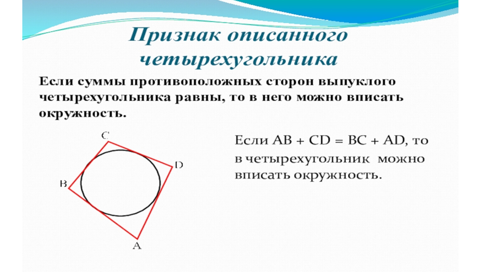 В любом описанном четырехугольнике суммы противоположных сторон равны.
