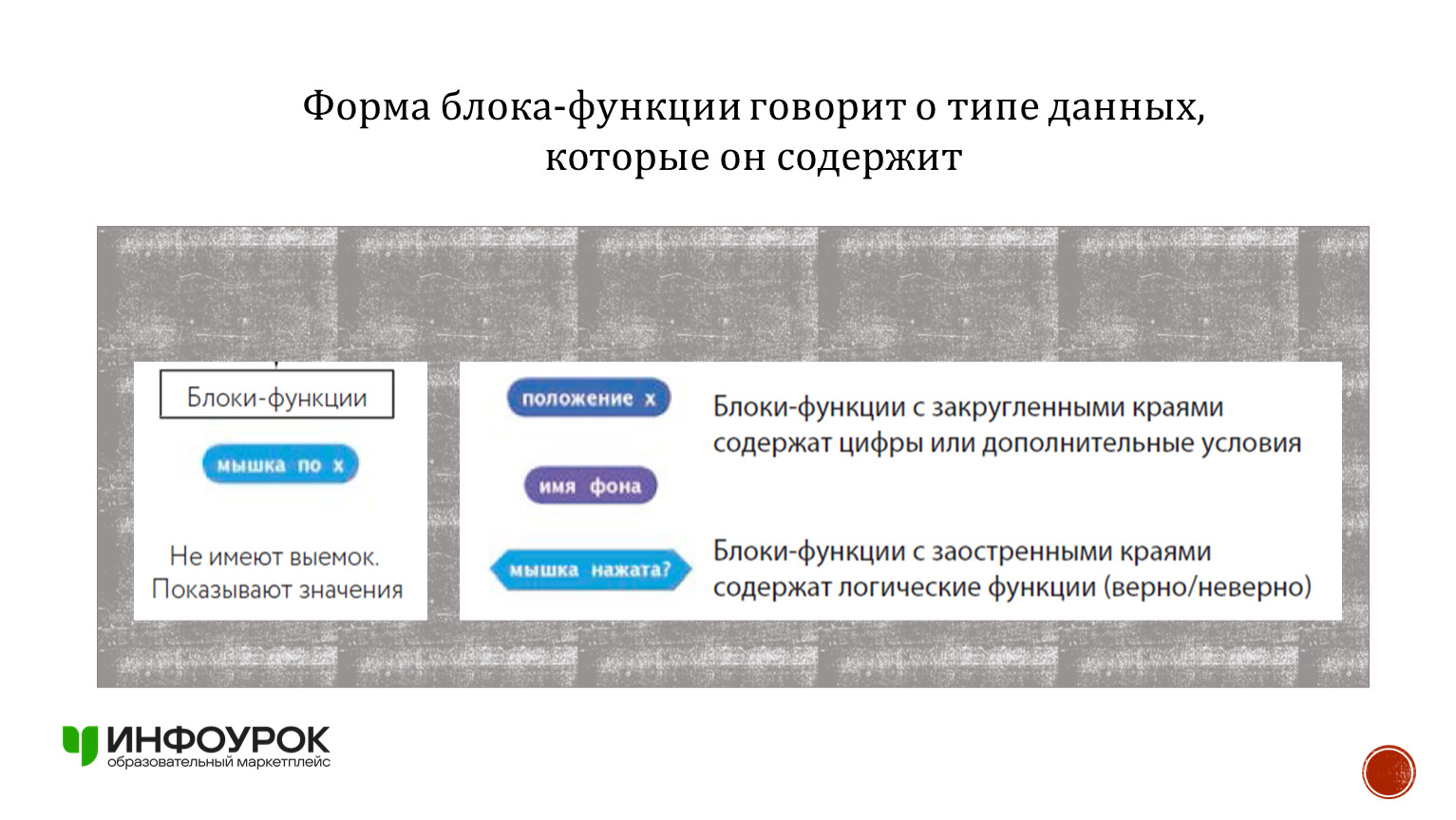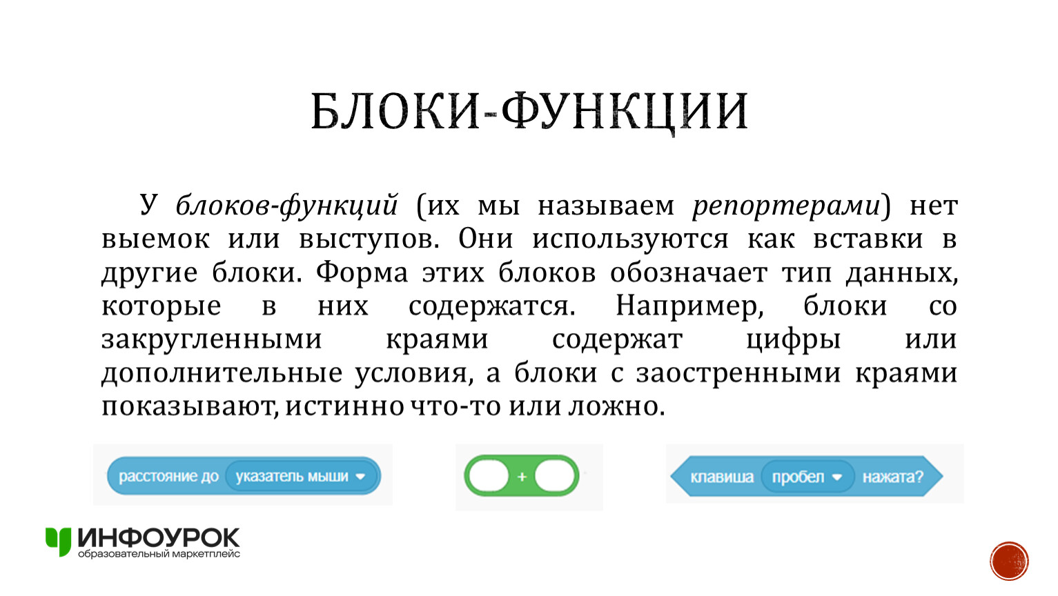 У блоков-функций (их мы называем репортерами) нет выемок или выступов. Они используются как вставки в другие блоки. Форма этих блоков обозначает тип данных, которые в них содержатся. Например, блоки со закругленными краями содержат цифры или дополнительные условия, а блоки с заостренными краями показывают, истинно что-то или ложно.