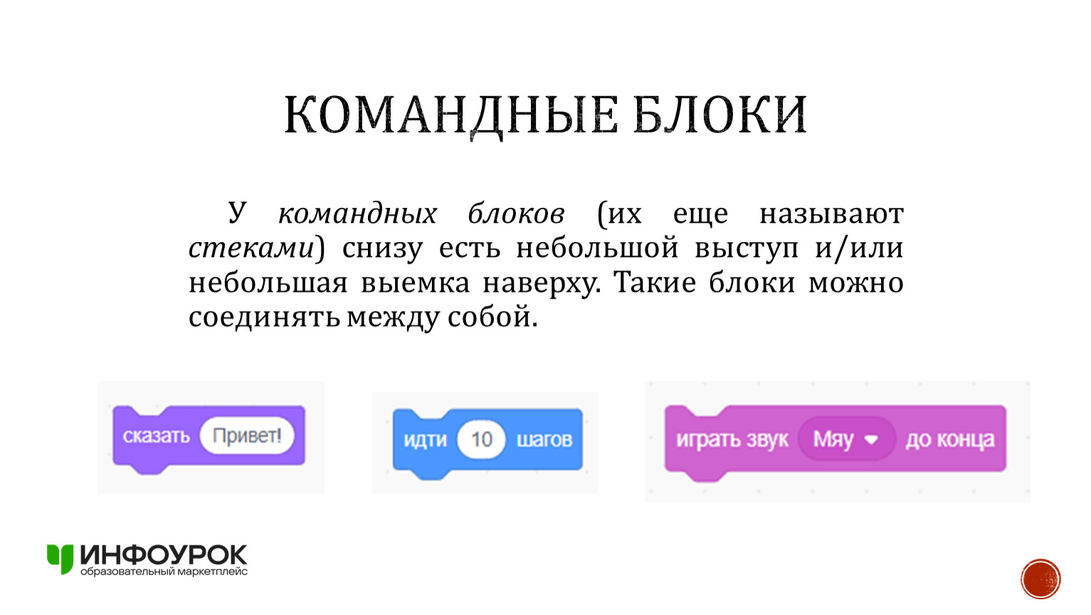 У командных блоков (их еще называют стеками) снизу есть небольшой выступ и/или небольшая выемка наверху. Такие блоки можно соединять между собой.