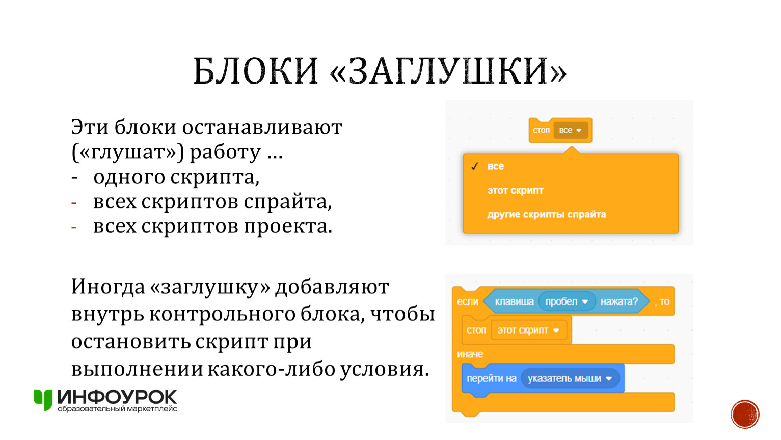Иногда «заглушку» добавляют внутрь контрольного блока, чтобы остановить скрипт при выполнении какого-либо условия.