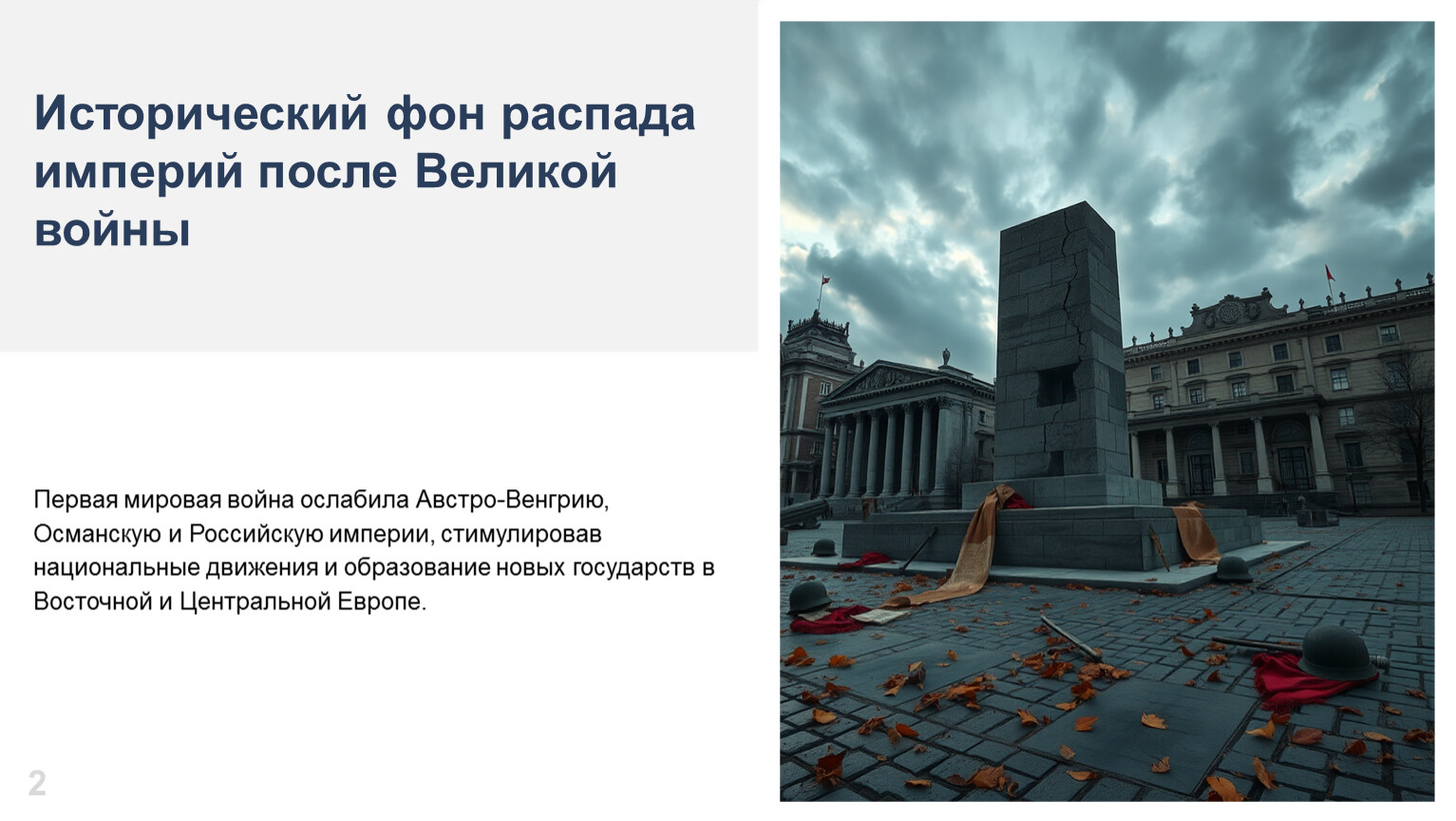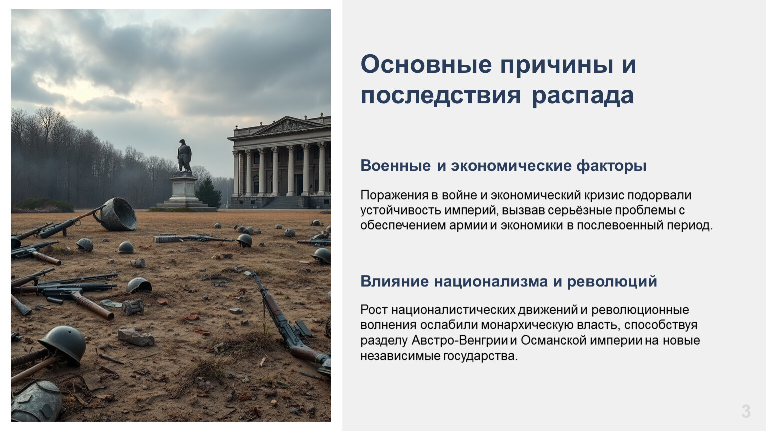 Основные причины и последствия распада Военные и экономические факторы Поражения в войне и экономический кризис подорвали устойчивость империй, вызвав серьёзные проблемы с обеспечением армии и экономики в послевоенный период. Влияние национализма и революций Рост националистических движений и революционные волнения ослабили монархическую власть, способствуя разделу Австро-Венгрии и Османской империи на новые независимые государства.