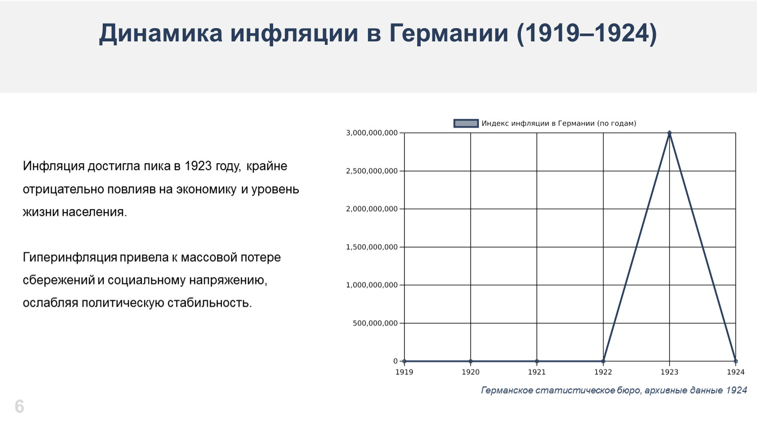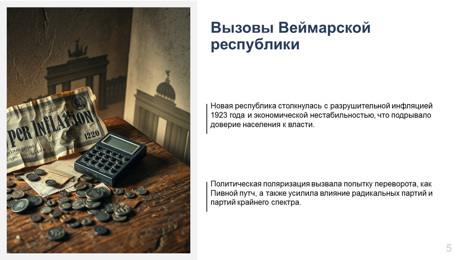 Новая республика столкнулась с разрушительной инфляцией 1923 года и экономической нестабильностью, что подрывало доверие населения к власти.