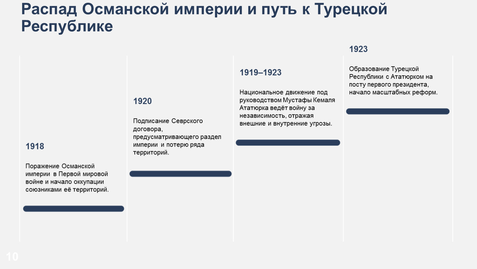 1923 Образование Турецкой Республики с Ататюрком на посту первого президента, начало масштабных реформ.