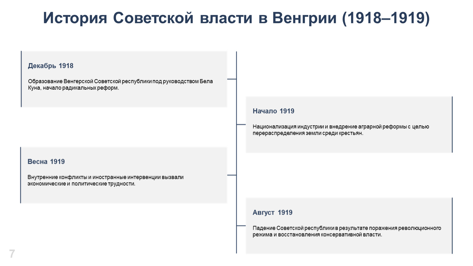 Декабрь 1918 Образование Венгерской Советской республики под руководством Бела Куна, начало радикальных реформ.