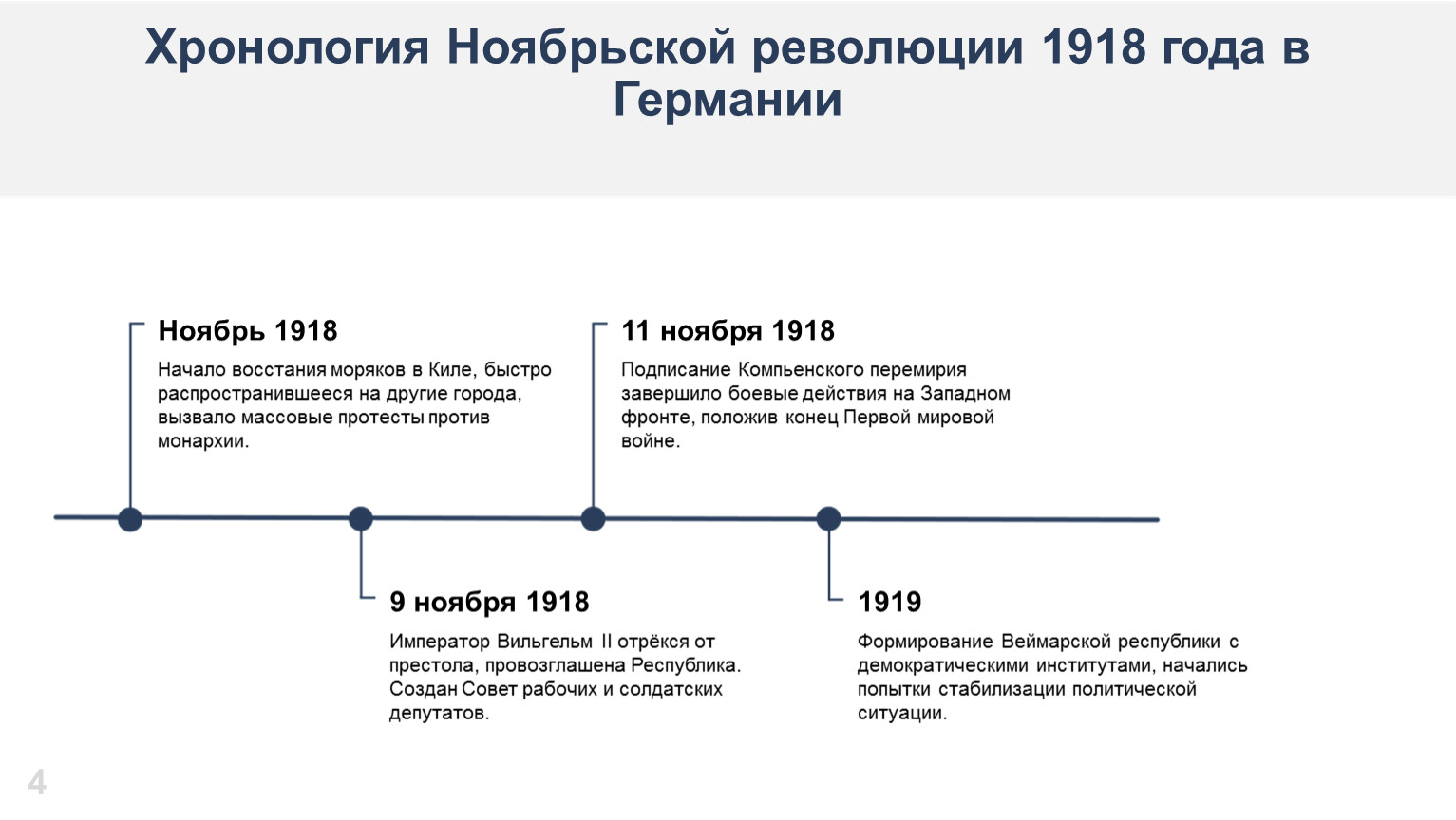 Ноябрь 1918 Начало восстания моряков в Киле, быстро распространившееся на другие города, вызвало массовые протесты против монархии.